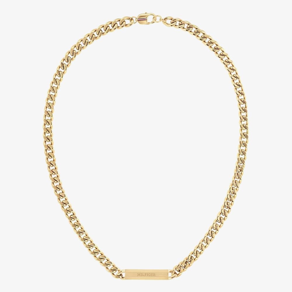 Featuring a bold gold-plated curb chain and a sleek bar engraved with the Hilfiger logo, this necklace brings modern edge and signature style to any look.