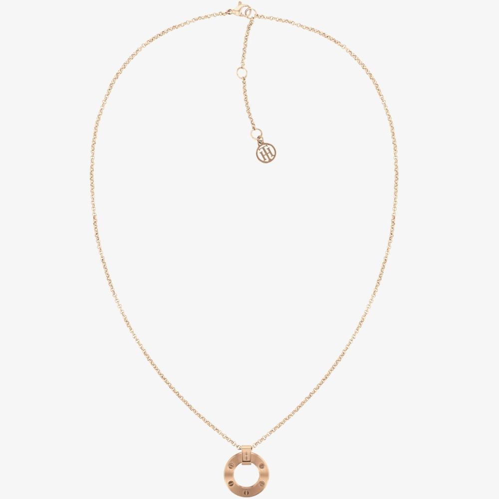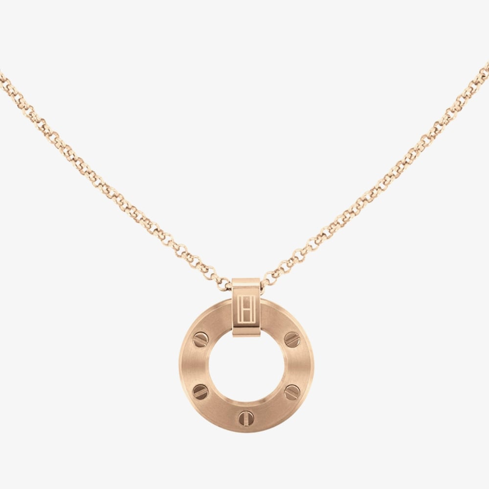 The Tommy Hilfiger Hardware Rose Gold-Tone Necklace 2780644 is created in stainless steel. This rose gold-tone necklace features an open circle design with a repeating screw pattern. This necklace also features an adjustable 60cm length belcher chain & is finished with a lobster clasp fastening.