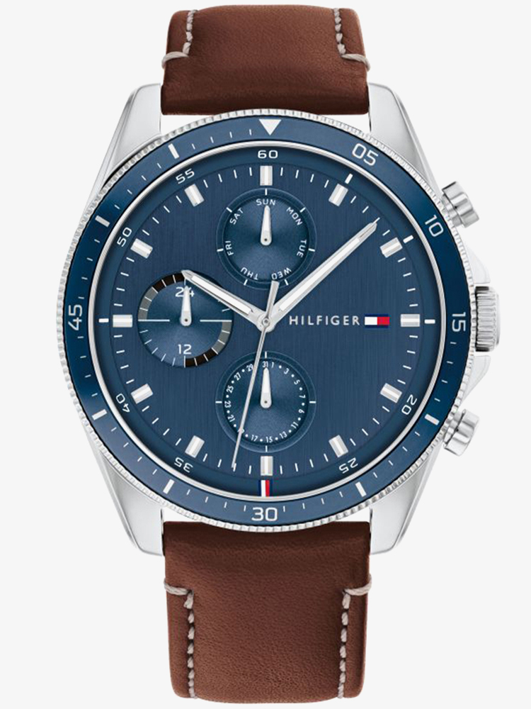 Tommy Hilfiger Mens Parker Brown Chronograph Leather Strap Watch 1791837 watch combines a stainless steel case and brown leather strap with a traditional buckle. It has a dark blue dial with luminescent silver batons and hands and Tommy Hilfiger logo detail protected beneath mineral crystal glass. The watch is powered by a quartz movement and has a water resistance of up to 50 metres, featuring a multi-dial chronograph display presenting day, date and 24-hour time information.