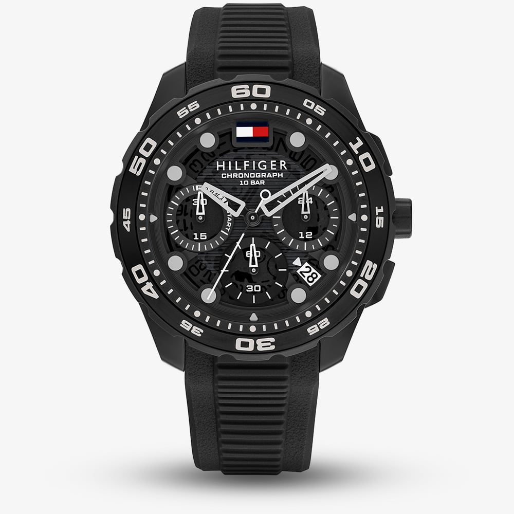 Sleek and athletic, the Tommy Hilfiger TH-Regatta makes a bold monochrome statement. Featuring an all-black plastic case, black silicone strap, and black bezel, this watch delivers a modern, stealth-inspired look. Light grey accents on the chronograph sub-dials, date window, and luminous hands and hour markers provide sharp contrast and clear visibility. Built for performance with undeniable style.