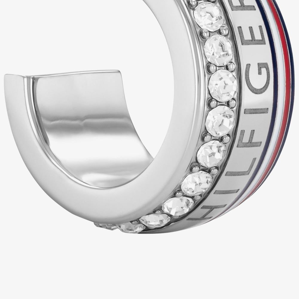 The Tommy Hilfiger Mesh Silver-Tone Hoop Earrings 2780623 are created in stainless steel. These silver-tone hoop 7.8mm width earrings feature a row of sparkling white cubic zirconia stones & the iconic Tommy Hilfiger coloured stripes. Diameter 15mm
