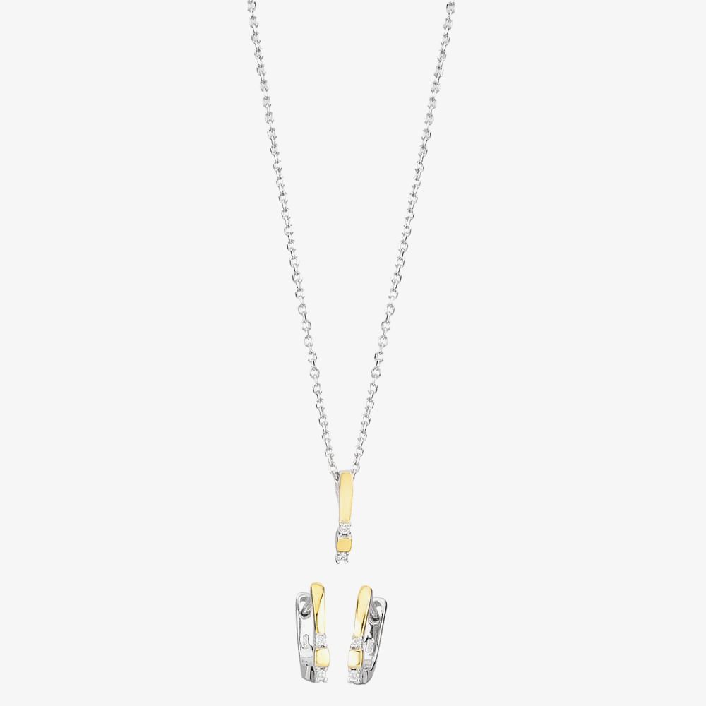 Add a touch of glamour to your outfit with these beautiful matching earrings and pendant. The focal point of each piece is the pop of colour provided by the polished gold plating, the surfaces of which curve gently to catch the light, contrasting against the high shimmer of the sparkling stones. The pendant has a hidden bale which is threaded onto a petite trace chain, whilst the earrings fasten via a hinged leverback system for ease of use.