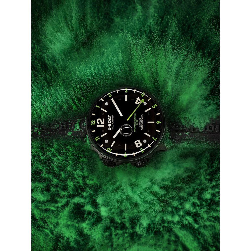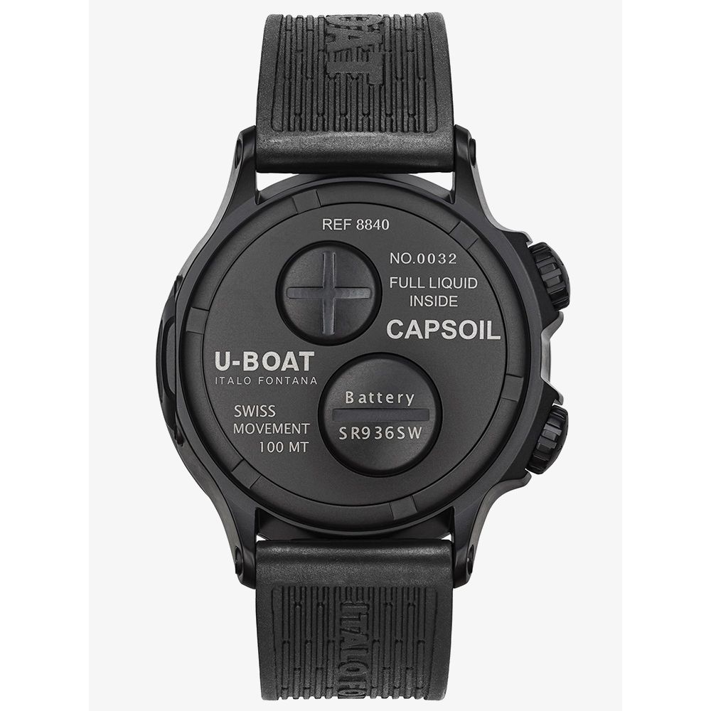 The U-BOAT Mens Capsoil 45mm Black Case & Green Hour Markers 8840 watch combines a 45mm round shaped stainless-steel case and black rubber strap with a traditional buckle. It has a black analogue dial with luminescent hands which is protected beneath high quality curved scratch resistant sapphire crystal glass. Power is generated by the quartz movement. This model also has a water resistance of up to 50 metres. This watch dial is completely filled with a special oil that emphasizes the dial and creates the illusion of the absence of glass. Watch also features a visible air bubble to compensate the temperature variations. Back of the watch also features a innovative ring locking system that helps for quick battery replacement.