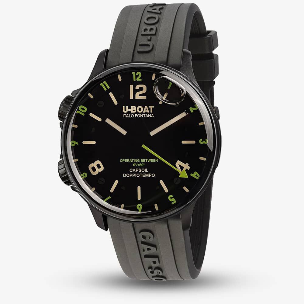 Watches and Wonders The U-BOAT Mens Capsoil 45mm Black Case & Green Hour Markers 8840 watch combines a 45mm round shaped stainless-steel case and black rubber strap with a traditional buckle. It has a black analogue dial with luminescent hands which is protected beneath high quality curved scratch resistant sapphire crystal glass. Power is generated by the quartz movement. This model also has a water resistance of up to 50 metres. This watch dial is completely filled with a special oil that emphasizes the dial and creates the illusion of the absence of glass. Watch also features a visible air bubble to compensate the temperature variations. Back of the watch also features a innovative ring locking system that helps for quick battery replacement.U-BOAThttps://www.thbaker.co.uk/media/catalog/product/0/6/06-07-006_02.jpghttps://www.thbaker.co.uk/media/catalog/product/0/6/06-07-006_03.jpg80510701940223add-to-cartcondition:Nodisc_no_stock:Yesex_display:NoNoYesNo2607006U-BOAT8840MensOfficial U-BOAT Packaging2 Year U-BOAT WarrantyClassicNoWatchBlackRubber StrapStainless SteelRound45mmAnalogueSapphire Crystal GlassBlack50 metresQuartzPin BuckleNoNoNoNoNoYesNoU-BOAT Mens Capsoil 45mm Black Case & Green Hour Markers Watch26-07-0062022-07-07 00:00:00[]2022-07-07