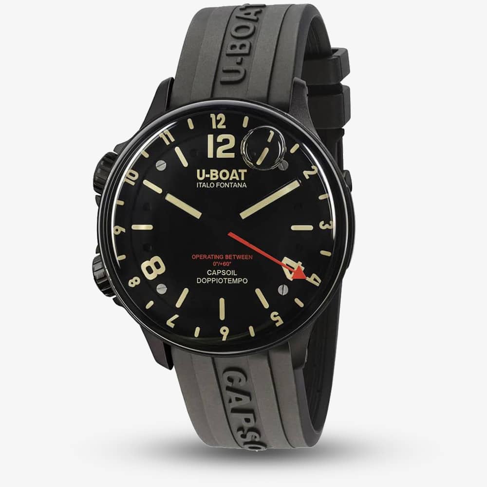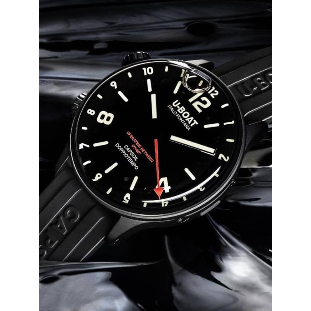 The U-BOAT Mens Capsoil 45mm Black Dial & Strap 8770 watch combines a 45mm round shaped stainless-steel case and black rubber strap with a traditional buckle. It has a black analogue dial with luminescent hands which is protected beneath nigh quality curved scratch resistant sapphire crystal glass. Power is generated by the quartz movement. This model also has a water resistance of up to 50 metres. This watch dial is completely filled with a special oil that emphasizes the dial and creates the illusion of the absence of glass. Watch also features a visible air bubble to compensate the temperature variations. Back of the watch also features a innovative ring locking system that helps for quick battery replacement