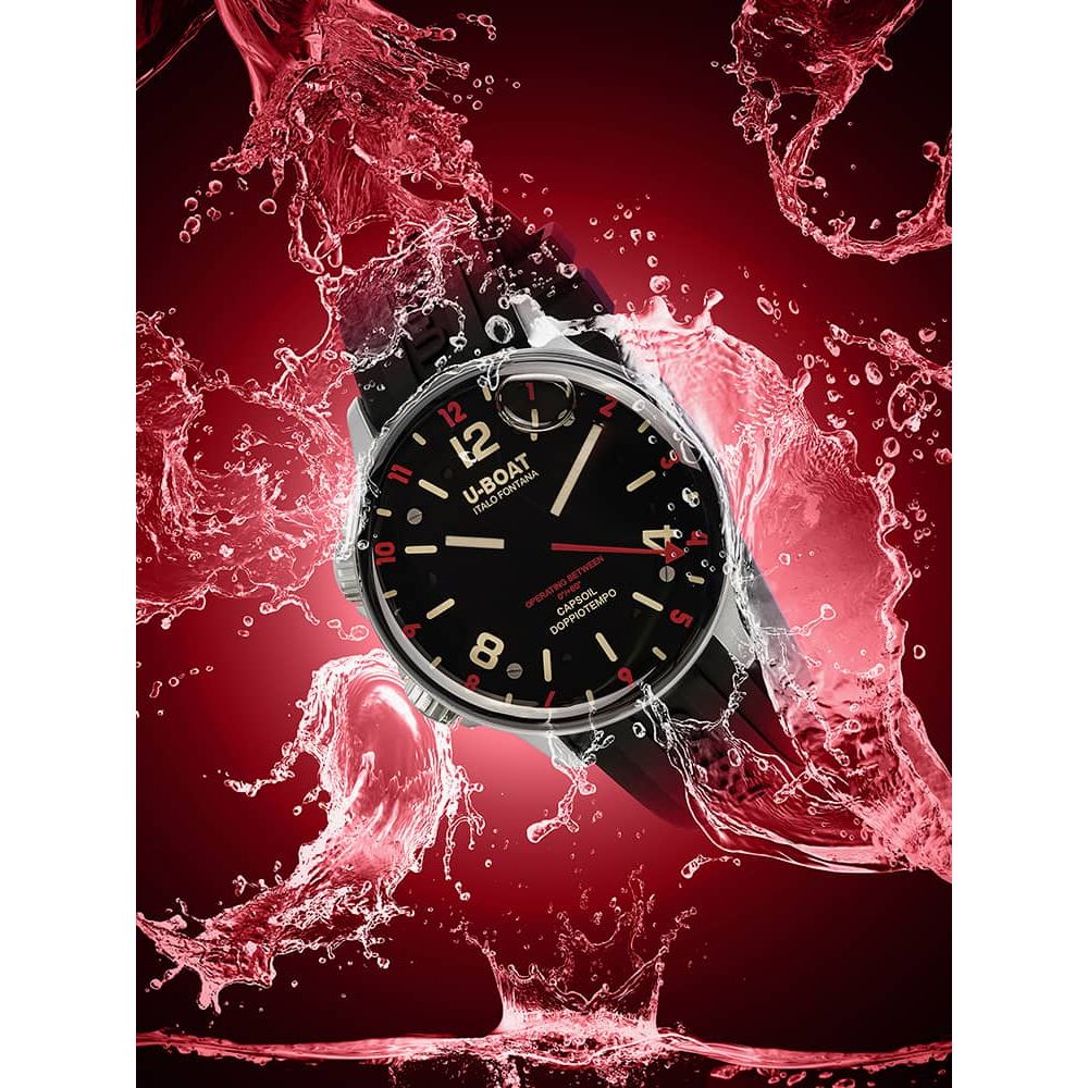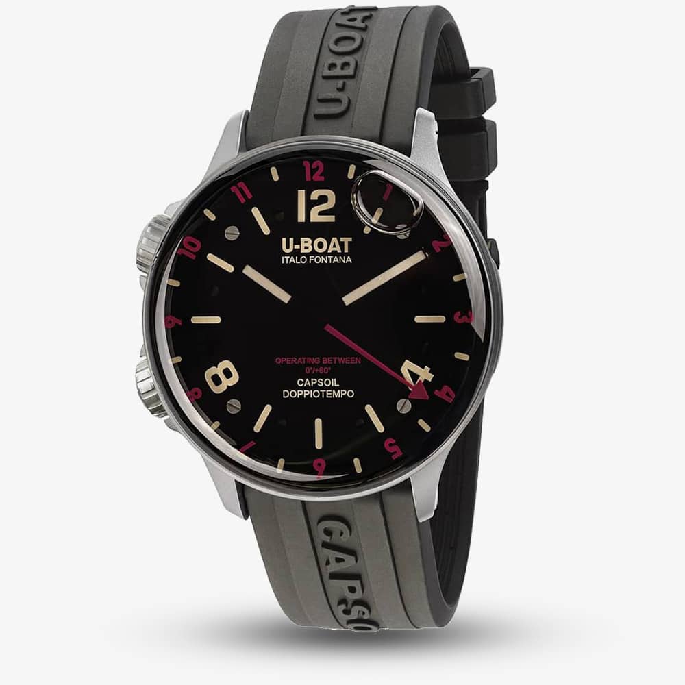 The U-BOAT Mens Capsoil 45mm doppiotempo Red Rehaut 8839 watch combines a 45mm round shaped stainless-steel case and black rubber strap with a traditional buckle. It has a black analogue dial with luminescent hands which is protected beneath domed scratch resistant sapphire crystal glass. Power is generated by the swiss quartz movement. This model also has a water resistance of up to 50 metres. This watch dial is completely filled with a special oil that emphasizes the dial and creates the illusion of the absence of glass. Watch also features a visible air bubble to compensate the temperature variations. Back of the watch also features a innovative ring locking system that helps for quick battery replacement.
