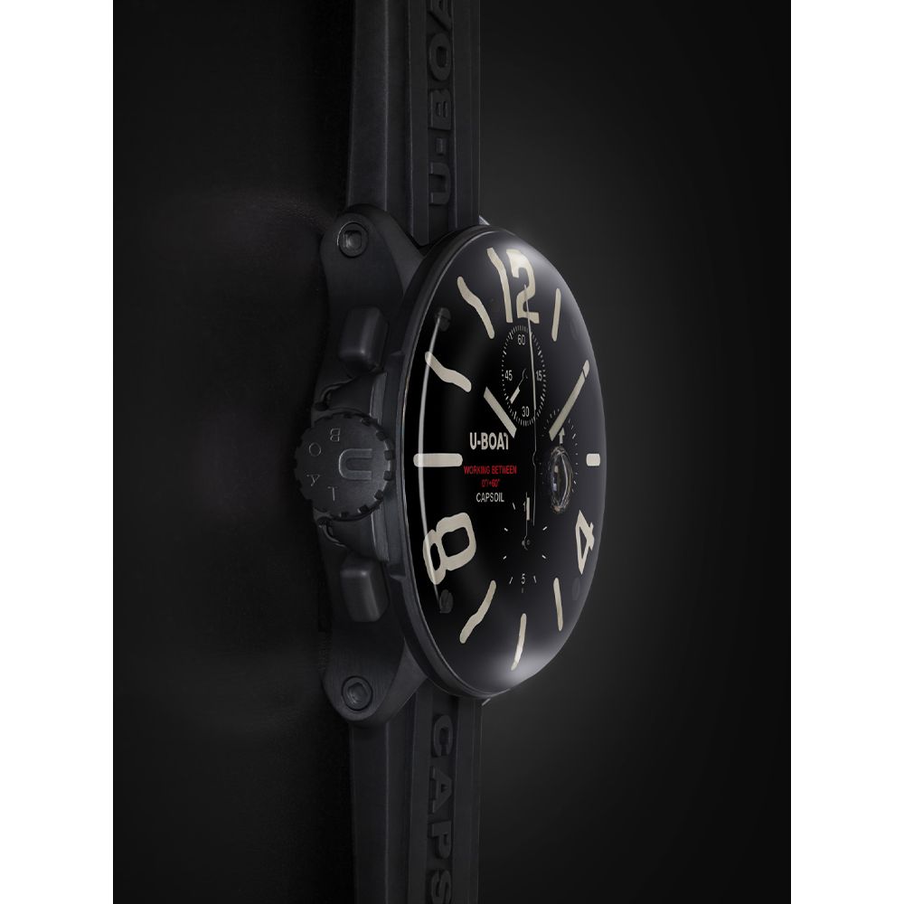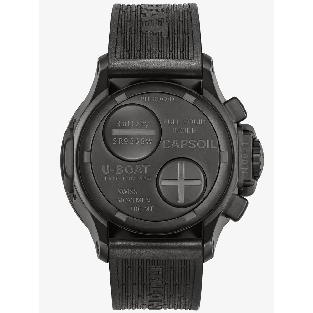 The U-BOAT U-BOAT Mens Capsoil Chronograph Black Case U8109/E watch combines a 45mm round shaped stainless-steel case and black rubber strap with a traditional buckle. It has a black analogue dial that features a chronograph with luminescent hands which is protected beneath domed curved scratch resistant sapphire crystal glass. Power is generated by the quartz movement. This model also has a water resistance of up to 50 metres. This watch dial is completely filled with a special oil that emphasizes the dial and creates the illusion of the absence of glass. Watch also features a visible air bubble to compensate the temperature variations. Back of the watch also features a innovative ring locking system that helps for quick battery replacement
