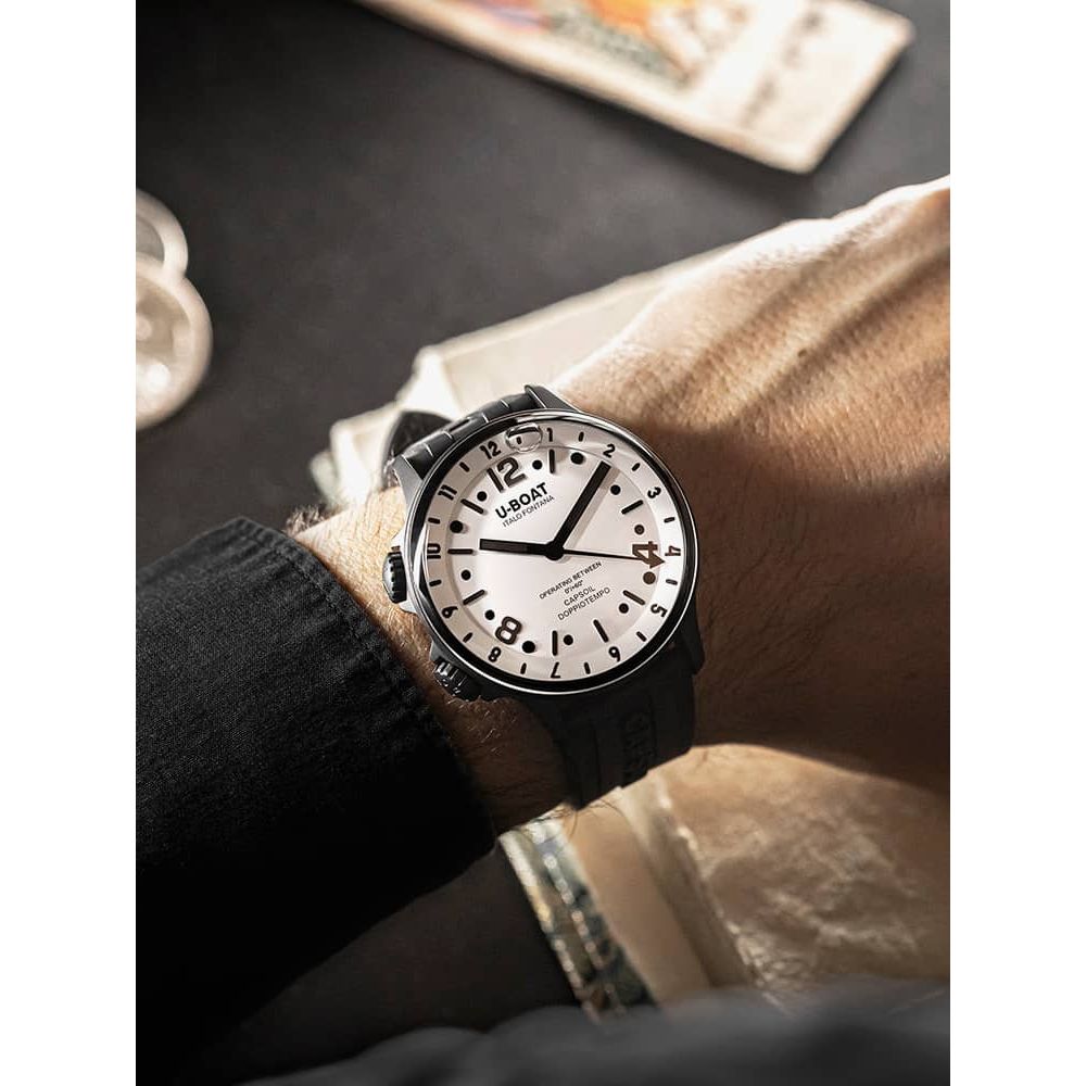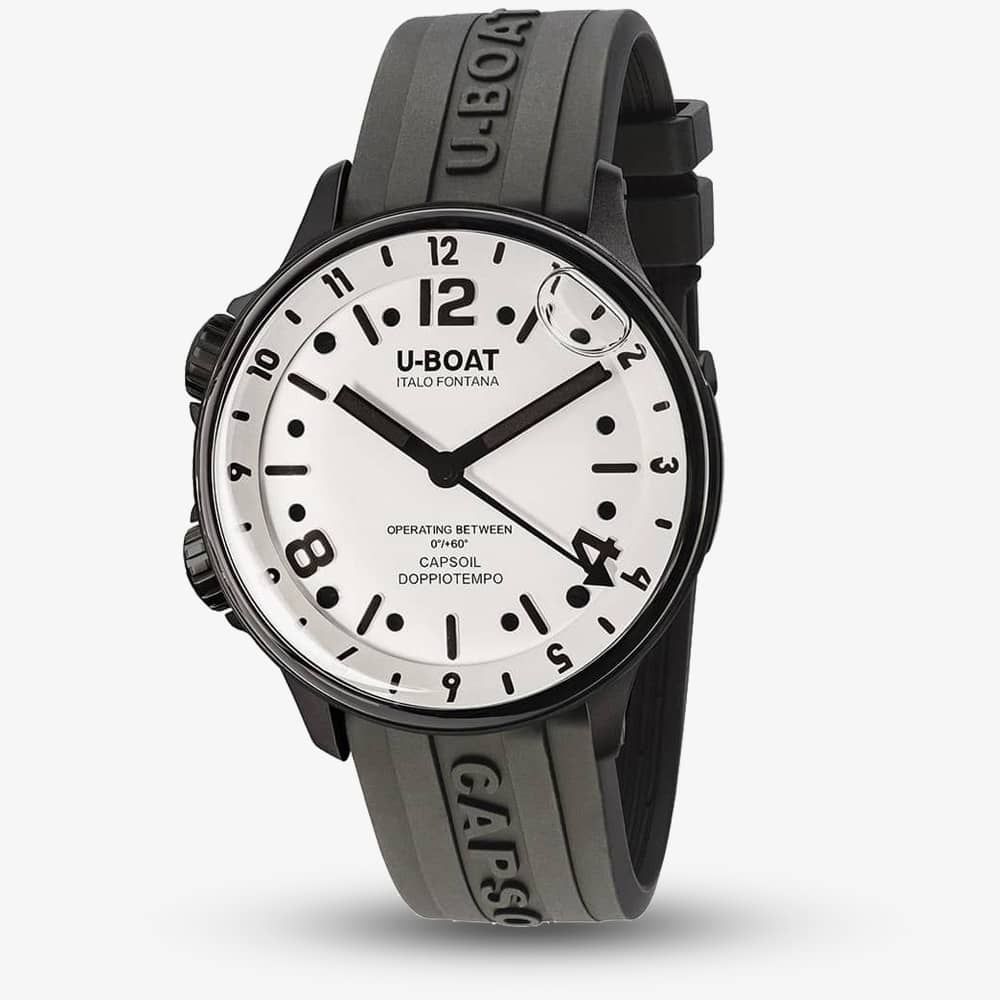 Watches and Wonders The U-BOAT Mens Capsoil Doppiotempo White Dial 8889 watch combines a 45mm round shaped stainless-steel case and black rubber strap with a traditional buckle. It has a white analogue dial with luminescent hands which is protected beneath high quality curved scratch resistant sapphire crystal glass. Power is generated by the quartz movement. This model also has a water resistance of up to 100 metres. This watch dial is completely filled with a special oil that emphasizes the dial and creates the illusion of the absence of glass. Watch also features a visible air bubble to compensate the temperature variations. Back of the watch also features a innovative ring locking system that helps for quick battery replacementU-BOAThttps://www.thbaker.co.uk/media/catalog/product/2/6/26-07-008_03.jpghttps://www.thbaker.co.uk/media/catalog/product/2/6/26-07-008_02.jpg80510701940162add-to-cartcondition:Nodisc_no_stock:Yesex_display:Nosearch_keywords:waterproofNoYesNowaterproof2607008U-BOAT8889MensOfficial U-BOAT Packaging2 Year U-BOAT WarrantyClassicNoWatchBlackRubber StrapStainless SteelRound45mmAnalogueSapphire Crystal GlassWhite100 metresQuartzPin BuckleNoNoNoNoNoYesNoU-BOAT Mens Capsoil Doppiotempo White Dial Watch26-07-0082022-07-07 00:00:00[]2022-07-07