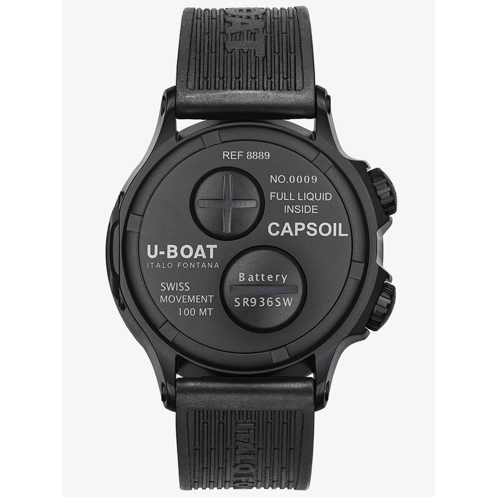 The U-BOAT Mens Capsoil Doppiotempo White Dial 8889 watch combines a 45mm round shaped stainless-steel case and black rubber strap with a traditional buckle. It has a white analogue dial with luminescent hands which is protected beneath high quality curved scratch resistant sapphire crystal glass. Power is generated by the quartz movement. This model also has a water resistance of up to 100 metres. This watch dial is completely filled with a special oil that emphasizes the dial and creates the illusion of the absence of glass. Watch also features a visible air bubble to compensate the temperature variations. Back of the watch also features a innovative ring locking system that helps for quick battery replacement