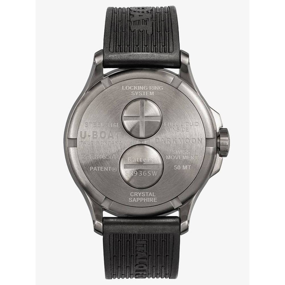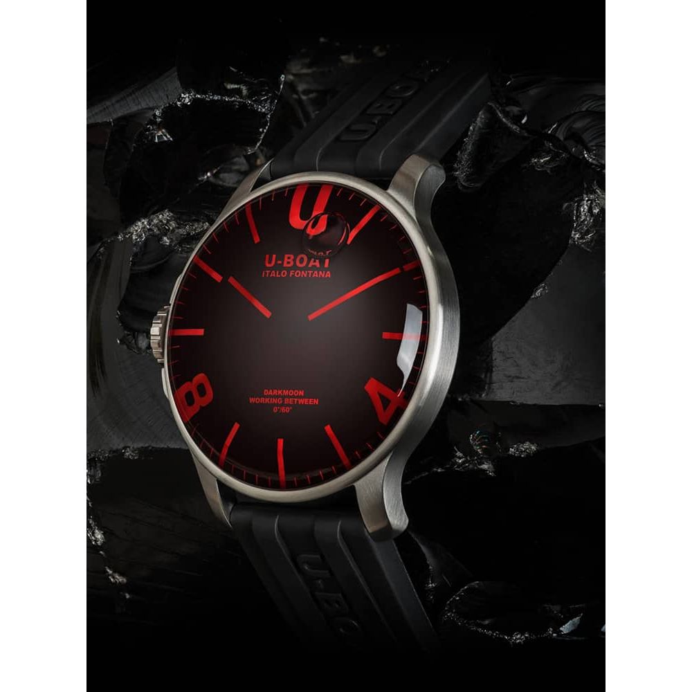 The U-BOAT Mens Darkmoon 44mm Red Glass 8465/B watch combines a 44mm round shaped stainless-steel case and black rubber strap with a traditional buckle. It has a black analogue dial with luminescent hands which is protected beneath domed scratch resistant sapphire crystal glass. Power is generated by the swiss quartz movement. This model also has a water resistance of up to 50 metres. This watch dial is completely filled with a special oil that emphasizes the dial and creates the illusion of the absence of glass. Watch also features a visible air bubble to compensate the temperature variations. Back of the watch also features a innovative ring locking system that helps for quick battery replacement