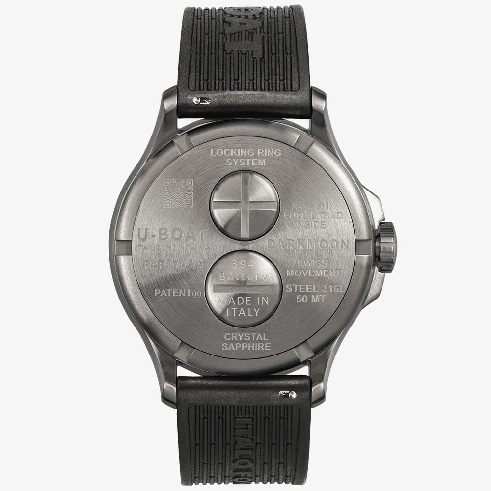 • 50 metre water resistance.U-BOAThttps://www.thbaker.co.uk/media/catalog/product/2/6/26-07-25155602_u-boat_02.jpghttps://www.thbaker.co.uk/media/catalog/product/2/6/26-07-25155602_u-boat_03.jpghttps://www.thbaker.co.uk/media/catalog/product/2/6/26-07-25155602_u-boat_04.jpg8056000104264add-to-cartcondition:Noex_display:Nosearch_keywords:luxuryNoNoluxury260725155602U-BOAT8704/EMensOfficial U-BOAT Packaging2 Year U-BOAT WarrantyLuxuryNoWatchBlackRubber StrapStainless SteelRound46.5mmAnalogueSapphire Crystal GlassBlueBlue50 metresQuartzPin BuckleNo StoneNo StoneNoNoNoNoNoYesNo{"name":"v12_finance","text":"Or from \u00a323 per month","imageUrl":"https:\/\/www.thbaker.co.uk\/media\/nosto\/v12-finance.png"}U-BOAT Mens Darkmoon 46.5mm Blue Soleil Black Rubber Strap Watch26-07-251556022026-03-03 00:00:0002026-03-03