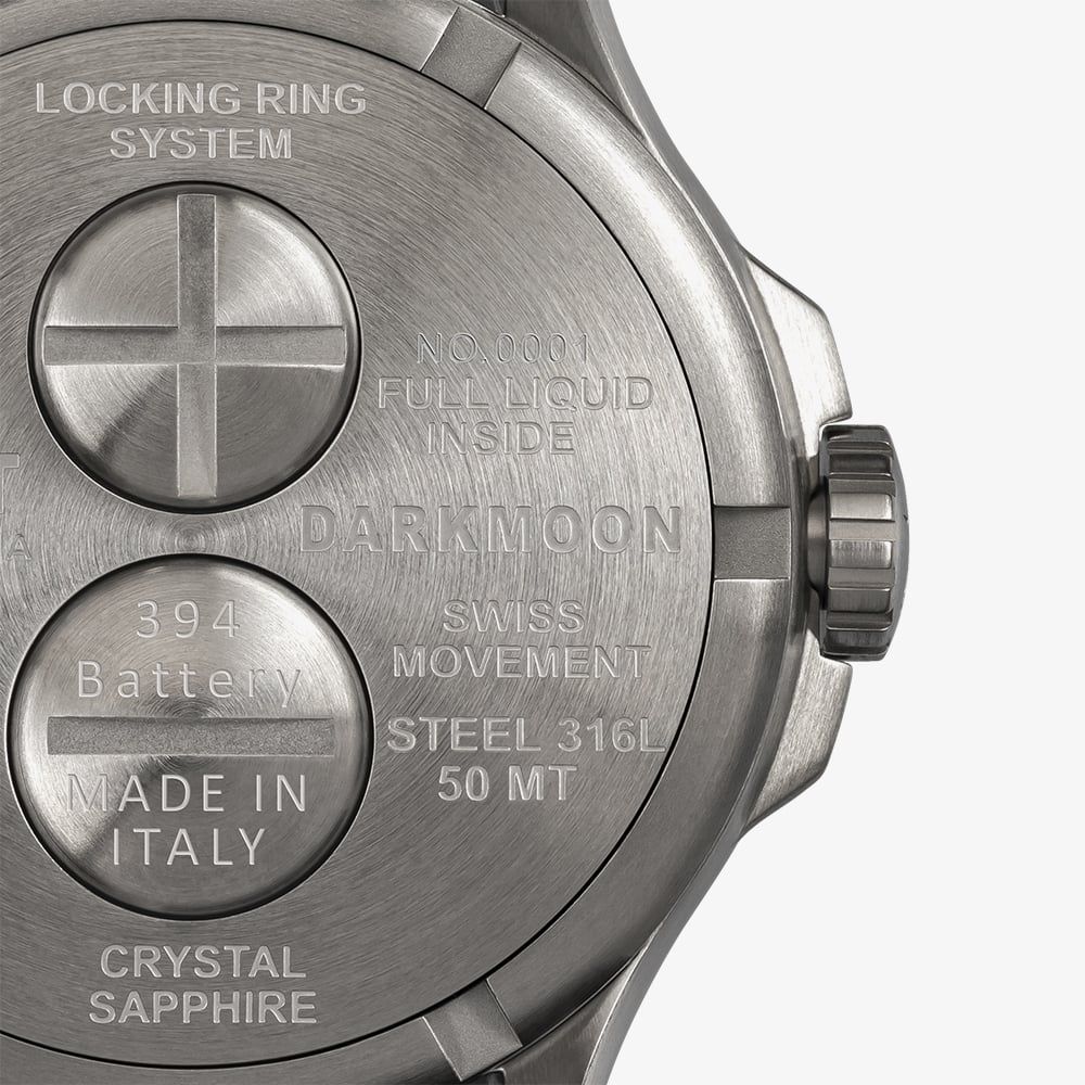 Refinement meets technical brilliance in the Darkmoon 8704/E, a timepiece that captures the essence of the night sky, with an innovative locking system for quick battery replacement. The polished stainless steel case houses a deep blue soleil dial, which transitions beautifully as it catches the light, reminiscent of the ocean depths. Because the movement is completely immersed in a special lubricating oil, the dial appears to lack the presence of glass, resulting in an ultra-legible and high-contrast aesthetic. This model suits the modern professional who desires a watch that is elegant, understated, and technically superior.