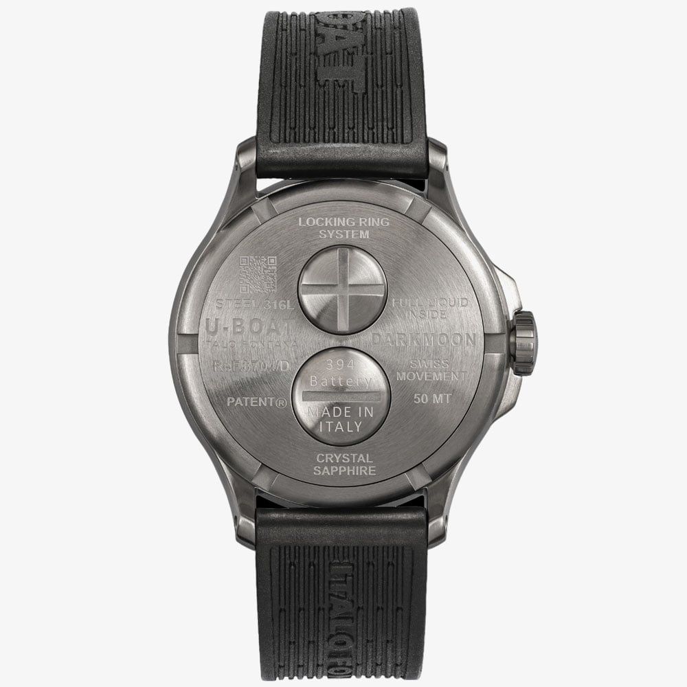 The U-BOAT Mens Darkmoon Stainless Steel Blue Dial 8704/D watch combines a 44mm round shaped stainless-steel case and black rubber strap with a traditional buckle. It has a blue analogue dial with luminescent hands which is protected beneath domed scratch resistant sapphire crystal glass. Power is generated by the swiss quartz movement. This model also has a water resistance of up to 50 metres. This watch dial is completely filled with a special oil that emphasizes the dial and creates the illusion of the absence of glass. Watch also features a visible air bubble to compensate the temperature variations. Back of the watch also features a innovative ring locking system that helps for quick battery replacement