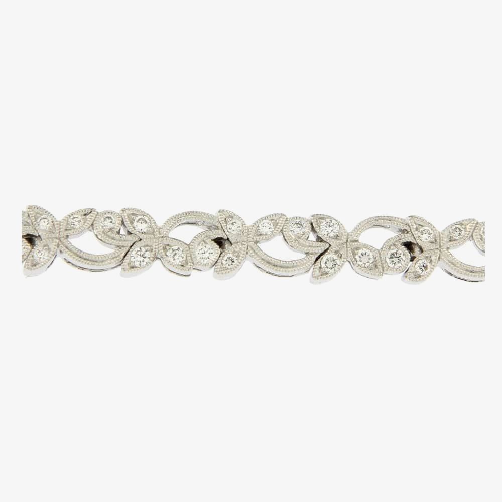 A stunning 18ct white gold fancy leaf bracelet set with 0.33ct of Diamonds delicately handcrafted with a mill grain design to complete that vintage look.