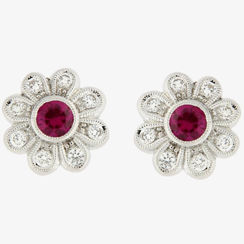A pair of intricate 18ct white gold flower shaped stud earrings set with a rubover Ruby centre, sparkling Diamond petals to surround which are finished with a mill grain edging to create a vintage look.