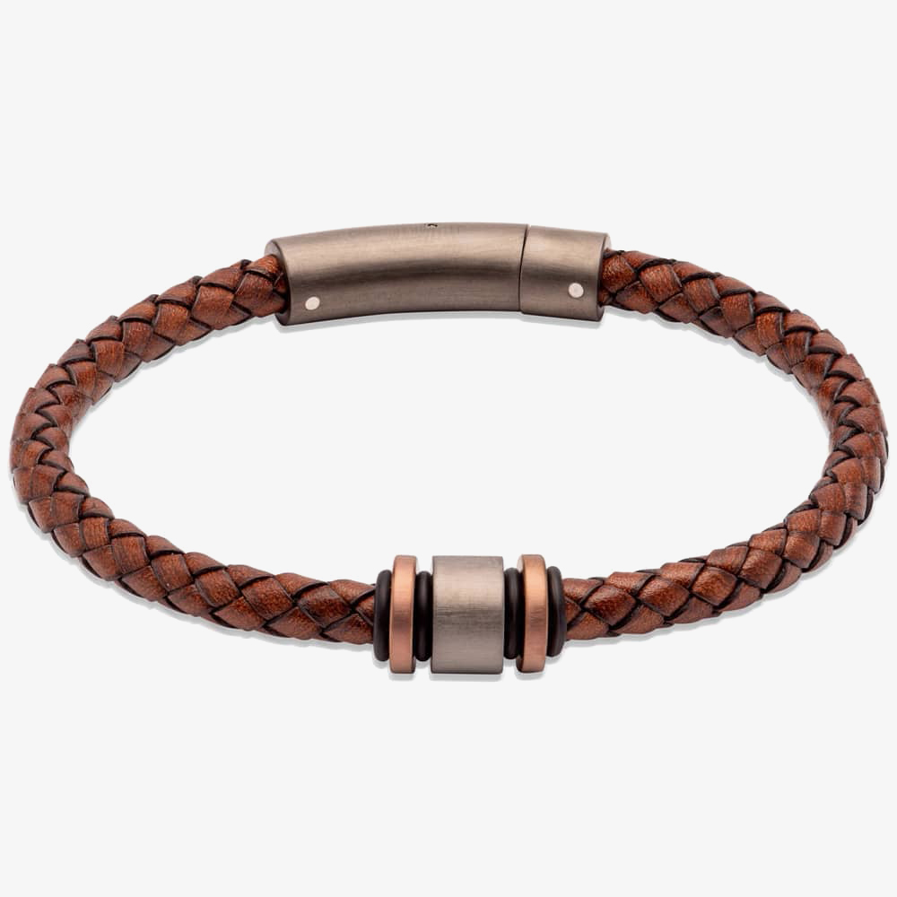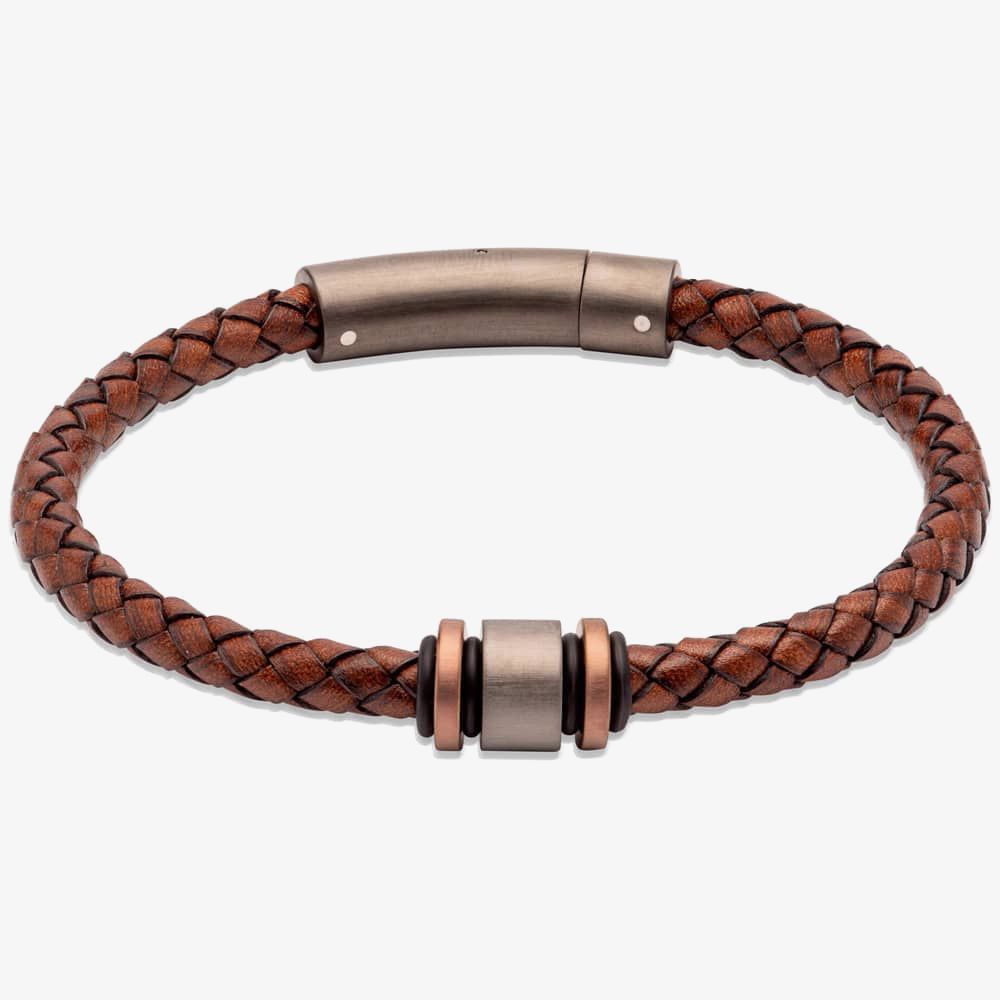 Add some on trend style to your collection with this leather bracelet from Unique Jewellery, crafted with dark brown braided leather, gunmetal and rose gold plated stoppers finished with a matching matte gunmetal plated stainless steel pusher clasp.
