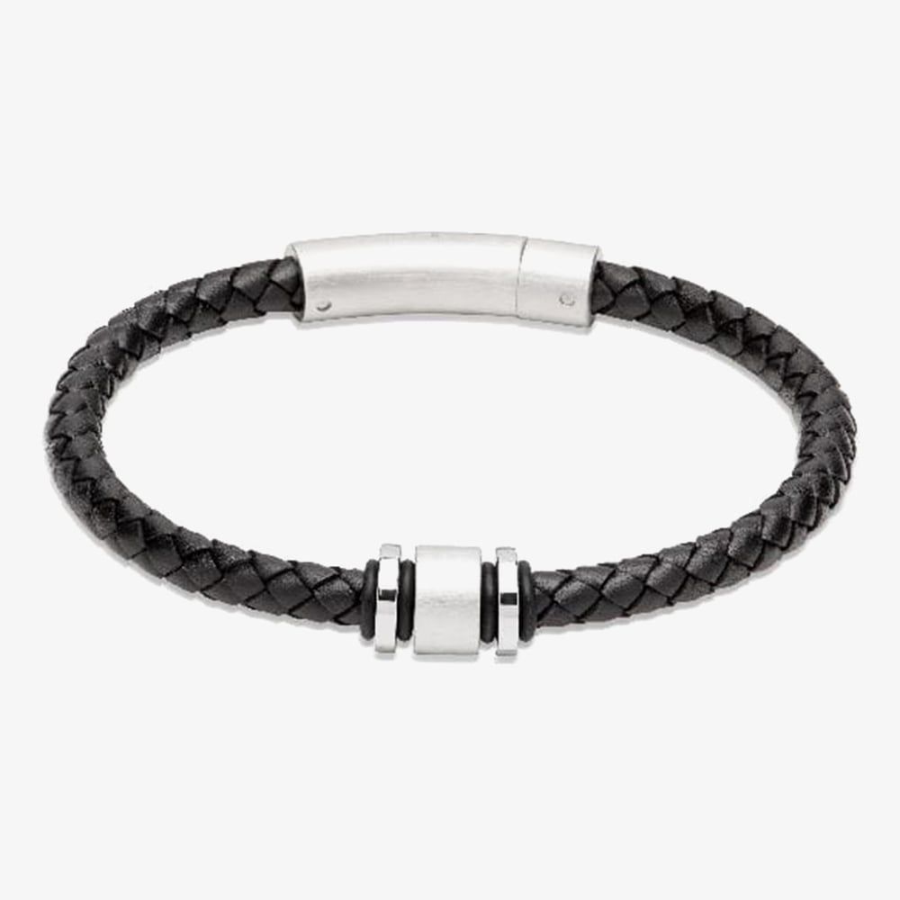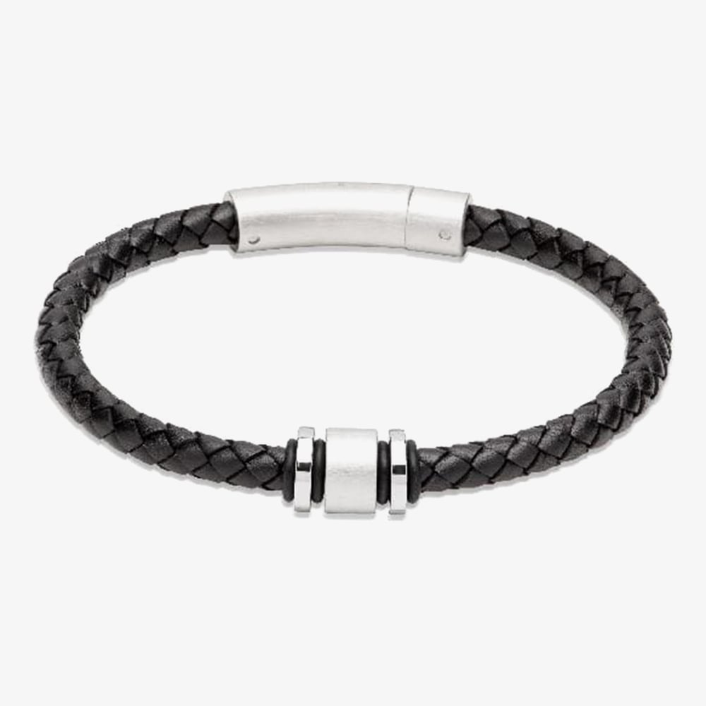 The Men's Black Leather Bracelet offers a sleek and timeless design, featuring a polished stainless steel accent and a secure stainless steel clasp. With a 21cm length, this bracelet pairs classic black leather with modern metal details, making it a versatile accessory for any outfit.
