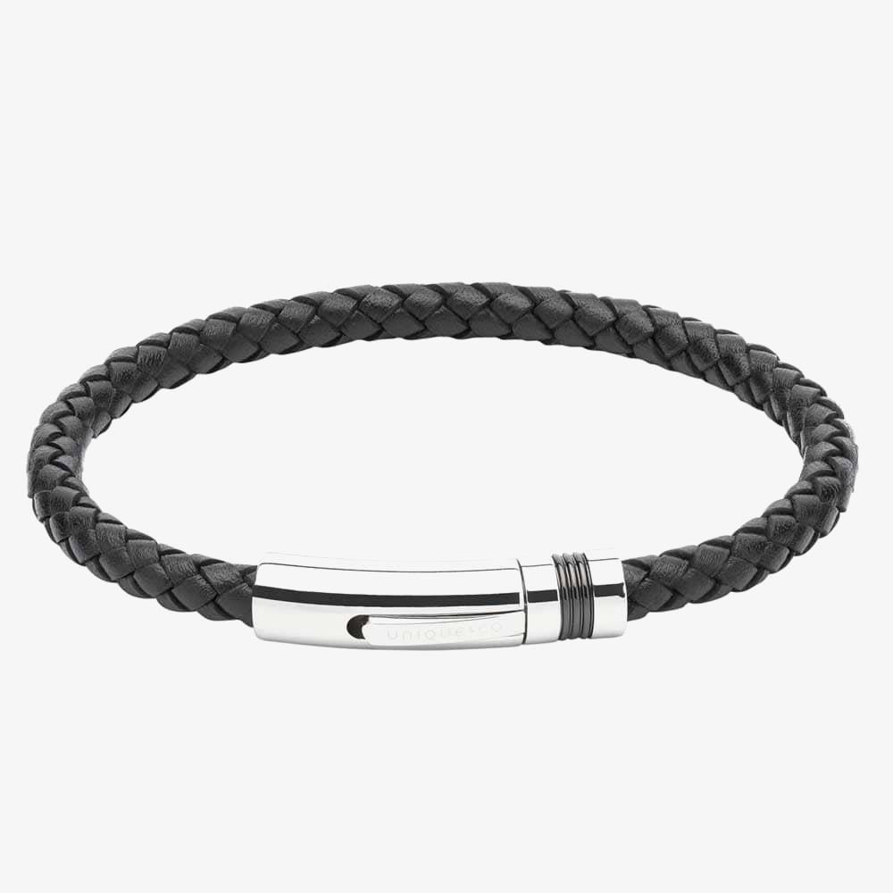 Unique have taken their staple braided bracelet and introduced a tonal twist- this thick black leather piece now has a matching black-IP ringed inlay on the high-polished clasp for that on-trend colour pop.