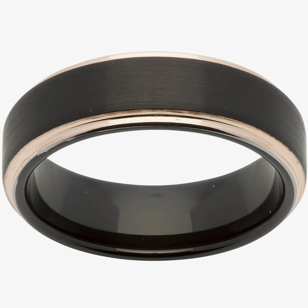 The Unique Mens Black & Rose Gold Plated Tungsten 7mm Ring TUR-55 is created in tungsten with black and rose gold plating and has a band width of 7mm. This hard wearing and durable ring can be worn individually or paired with similar items from the collection to compete your look.