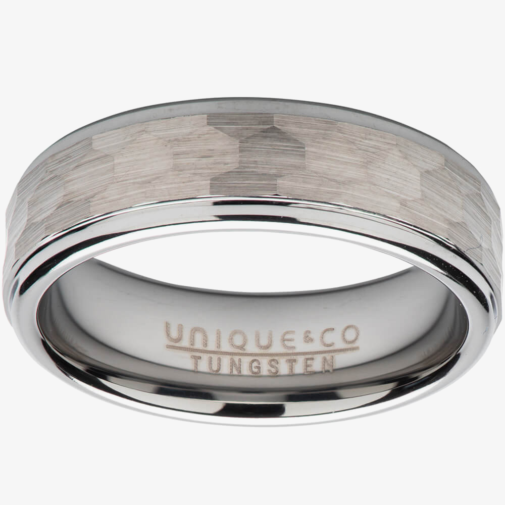 The Unique Mens Hammered Tungsten 7mm Ring TUR-114 is created in tungsten with a hammered design and a band width of 7mm. This hard wearing and durable ring can be worn individually or paired with similar items from the collection to compete your look.