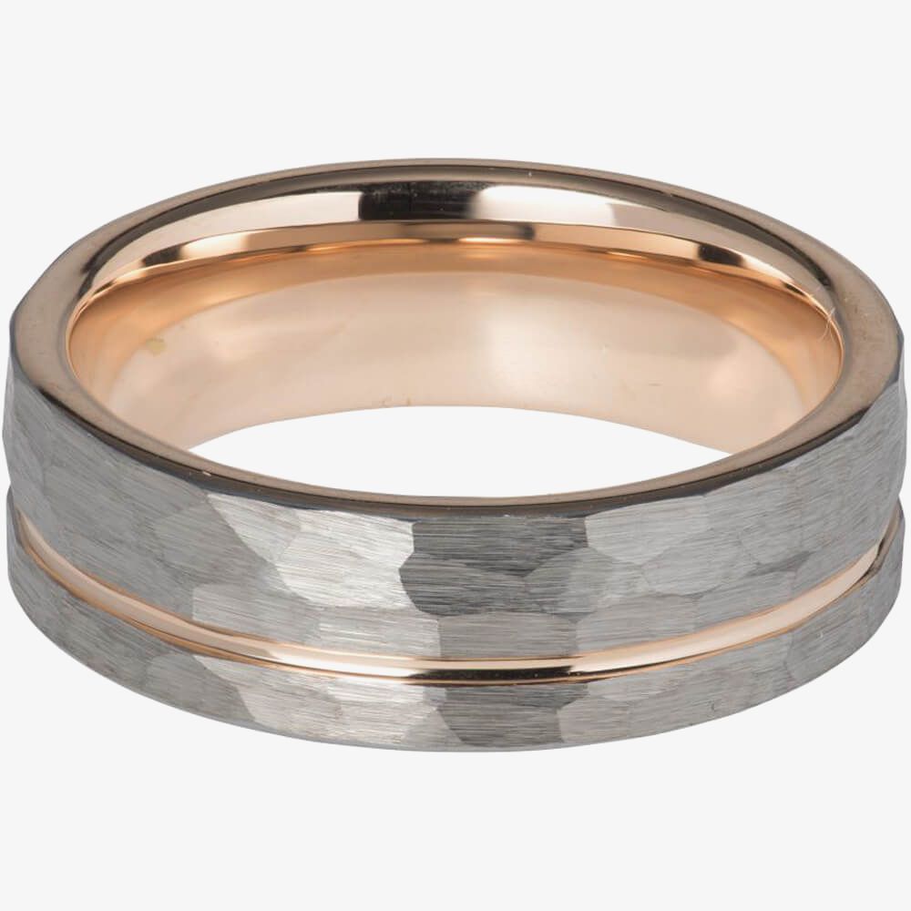 The Unique Mens Rose Gold Plated Hammered Tungsten 7mm Ring TUR-80 is created in tungsten with rose gold plating. It has a hammered design and a band width of 7mm. This hard wearing and durable ring can be worn individually or paired with similar items from the collection to compete your look.
