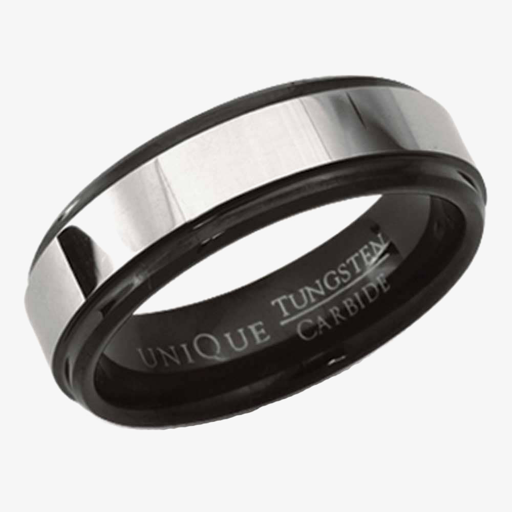 This model features a flat profile, bevelled black ion-plated edges and interior, and a central band with a high-polished finish.