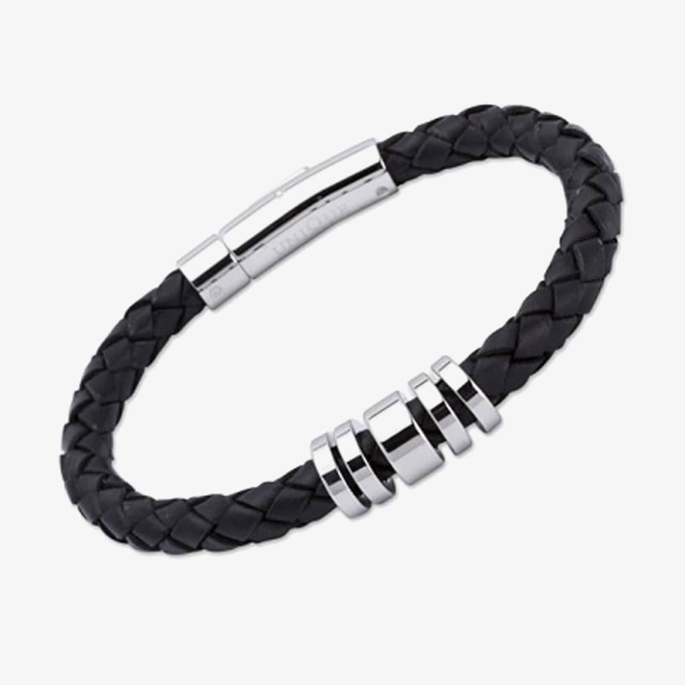 Five shining steel rings bring stunning contrast to this black bracelet, formed from woven strips of genuine leather. Perfect for casual wear or for a more formal occasion, this item is the latest in the on-trend range provided by Unique Jewellery.