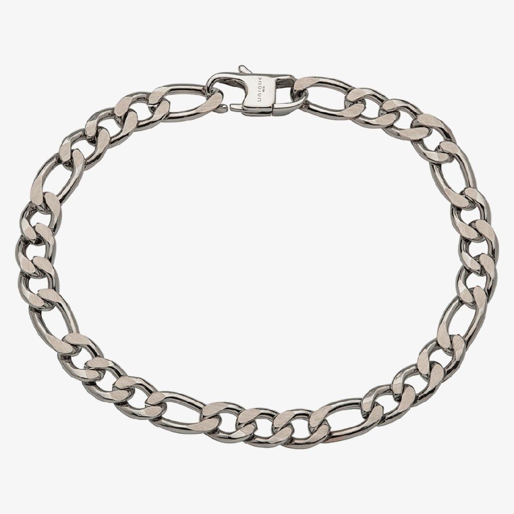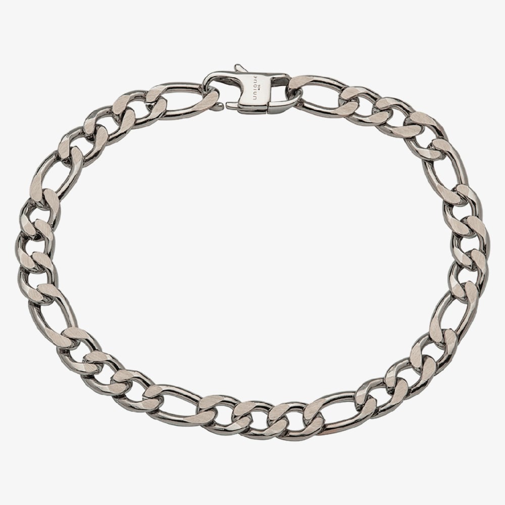 The Men's Stainless Steel Silver Figaro Chain Bracelet features a stylish Figaro link design in polished stainless steel. Measuring 21cm in length, it secures with a sturdy lobster clasp, offering a blend of elegance and durability for everyday wear or special occasions.