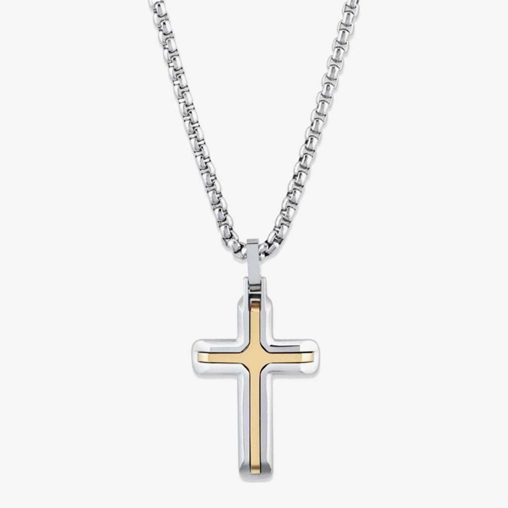 A stainless steel belcher necklace featuring a polished gold-plated cross pendant. The sturdy chain enhances the elegant shine of the pendant, blending durability with a touch of luxury. This striking piece adds a refined, timeless charm to any outfit, perfect for everyday wear or special occasions.