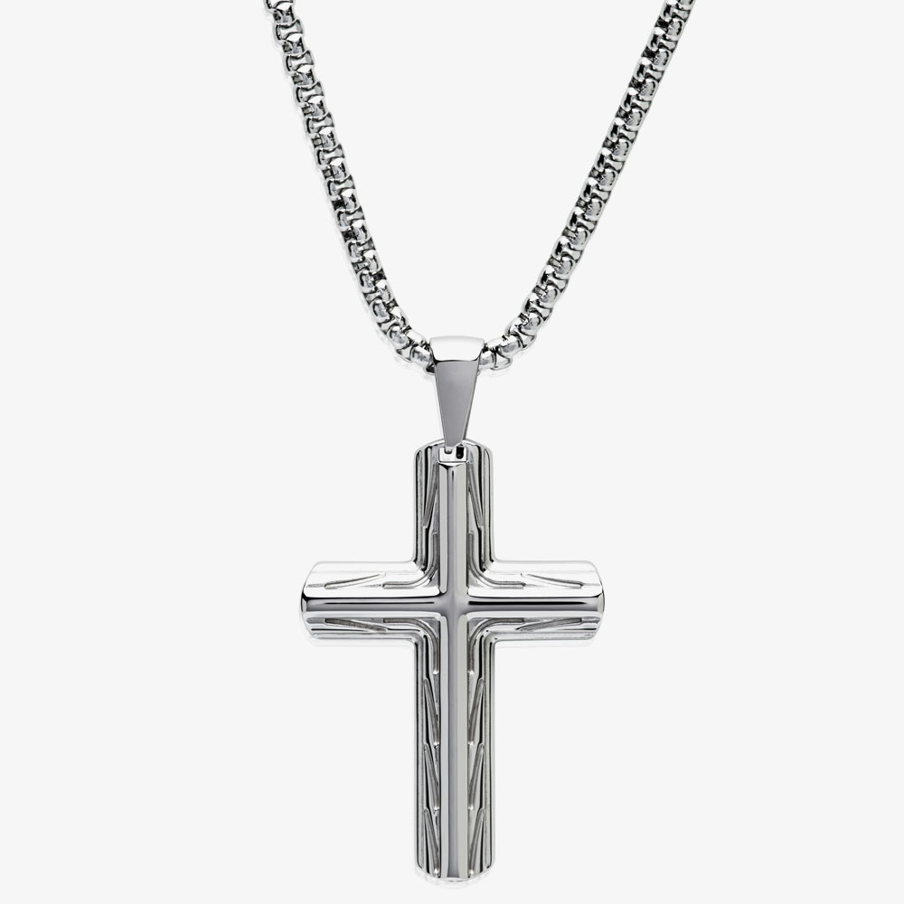 The intricately designed cross pendant hangs elegantly from a rounded box belcher chain, all crafted in durable stainless steel. Elevate your look with this timeless and meaningful accessory.