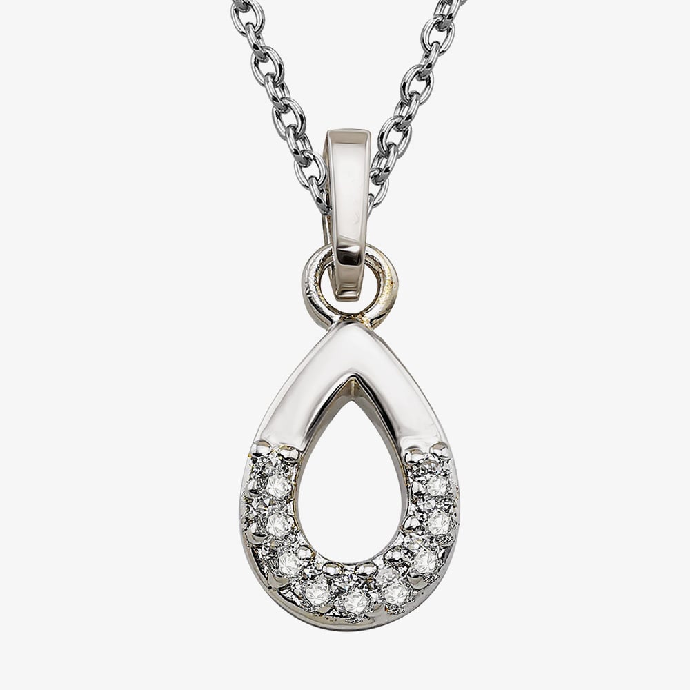 Crafted from rhodium plated sterling silver for a radiant shine, this open teardrop shaped pendant is half set with round, white cubic zirconia for a subtle touch of sparkle. Suspended from a 50cm trace chain, this pendant necklace by Unique is ideal for every day wear and elevating your day to night outfits.
