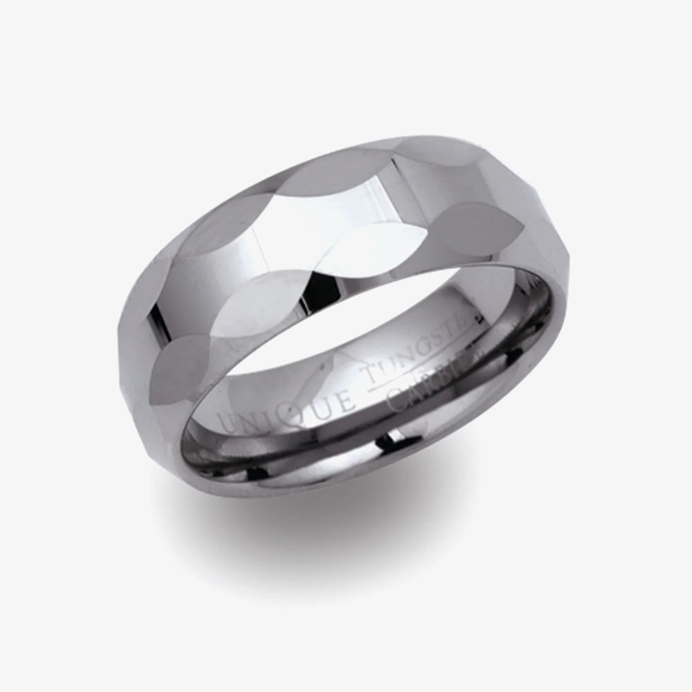 This striking Unique & Co men's wedding band is crafted from robust tungsten, featuring an 8mm wide band with a distinctive patterned bevelled edge. Combining timeless style with modern detailing, it’s a perfect symbol of lasting commitment.
