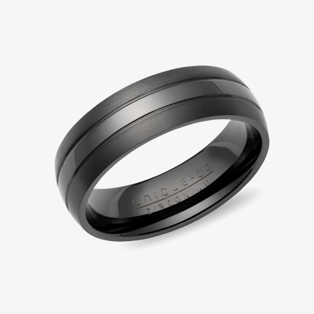 A sleek 7mm black zirconium ring featuring a ridge, plain design. This minimalist ring offers a bold, modern look with the durability of zirconium, making it both stylish and resilient for everyday wear or special occasions. Its matte black finish adds an elegant, understated touch.