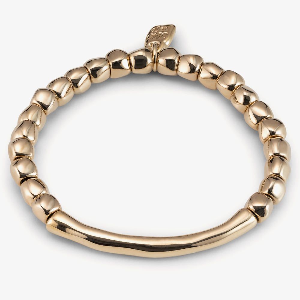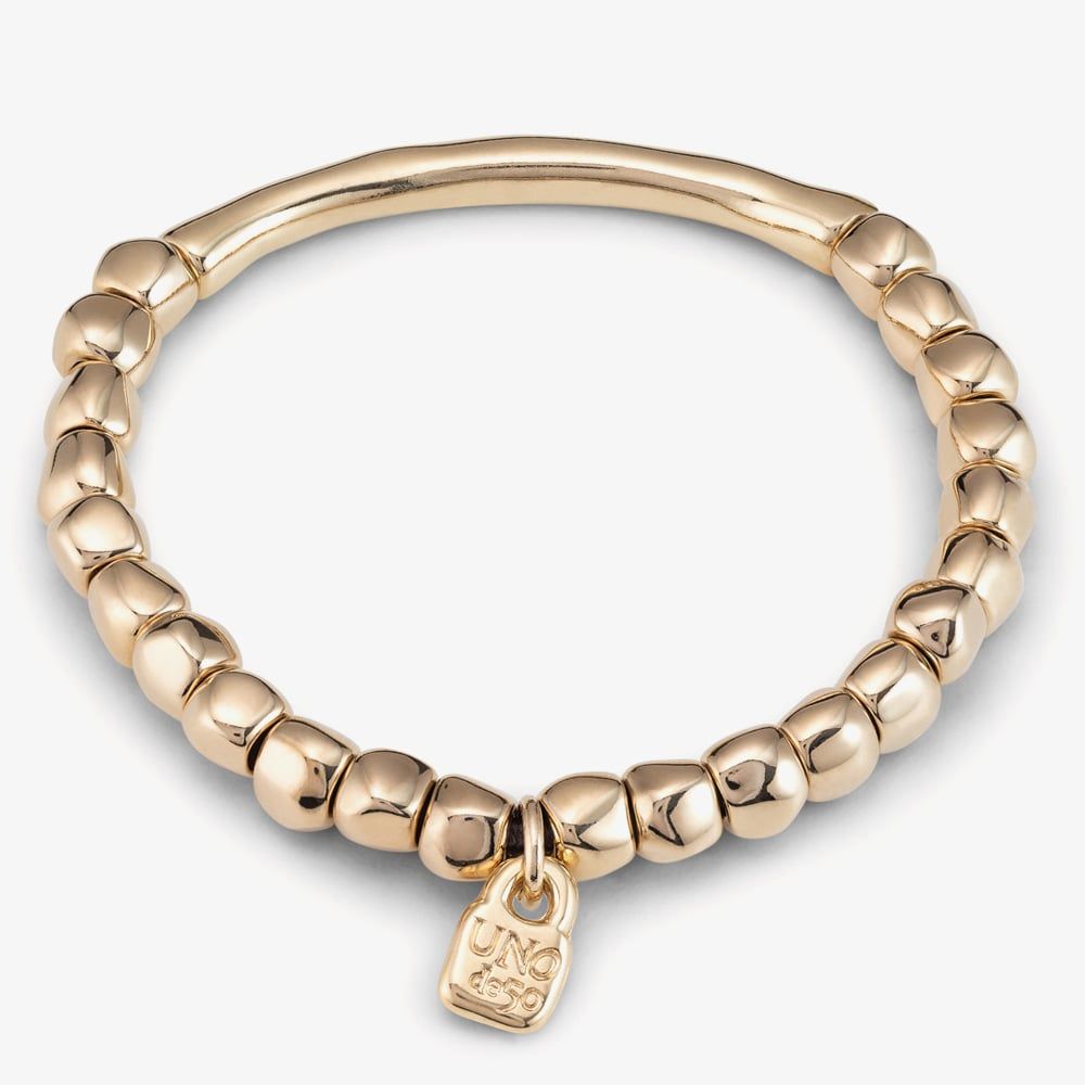 This attractive UNOde50 bracelet combines a series of gold plated beads with a fixed gold plated bar and small branded UNOde50 logo trinket, providing a subtle classic look to any occasion. Made from 15-25 micron gold plated Zamak bespoke to UNOde50 and available at 15cm length on an expandable bracelet, this is the perfect piece for anyone looking for a classic look.
