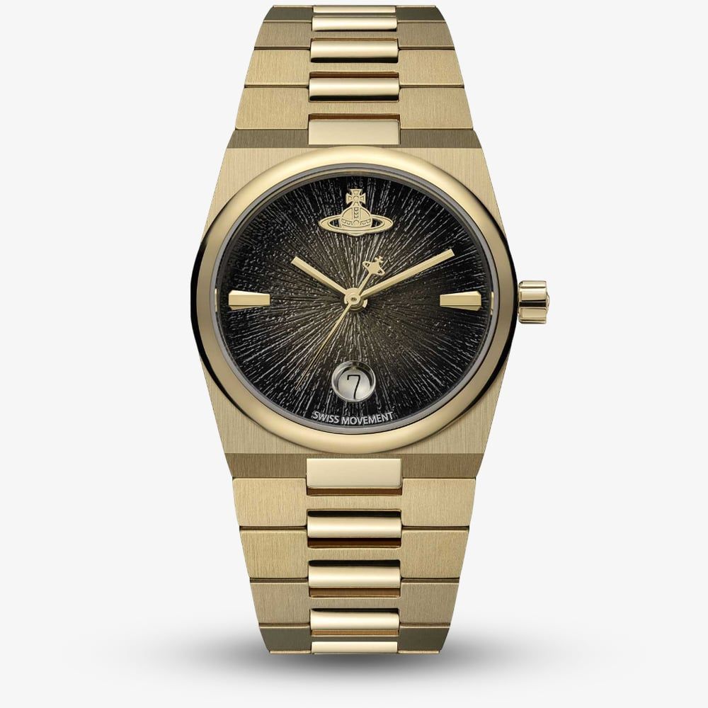 A perfect blend of sophistication and contemporary edge. Featuring a sleek gold-tone stainless steel case, this striking timepiece is complemented by a deep black dial, creating a dramatic contrast that exudes elegance and confidence. Designed for the fashion-forward woman, this watch includes the iconic Vivienne Westwood orb, subtly incorporated to reflect the brand’s signature style.