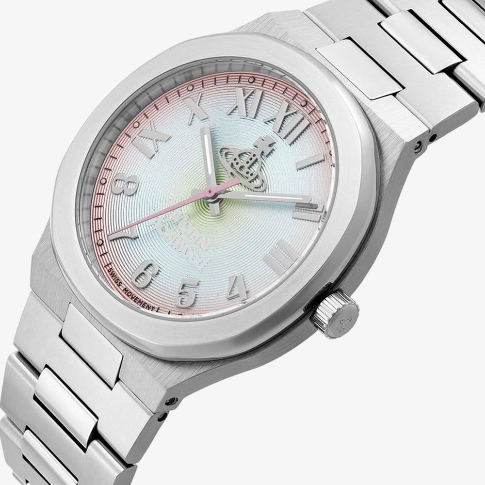 This eye-catching watch features a multicolour dial with a stunning spectrum of soft tones that shift and shimmer with every movement. At its centre sits the signature Vivienne Westwood orb, adding a rebellious edge to the elegant aesthetic. The silver-tone stainless steel case and bracelet provide a sleek, modern contrast, making the colours of the dial truly stand out.