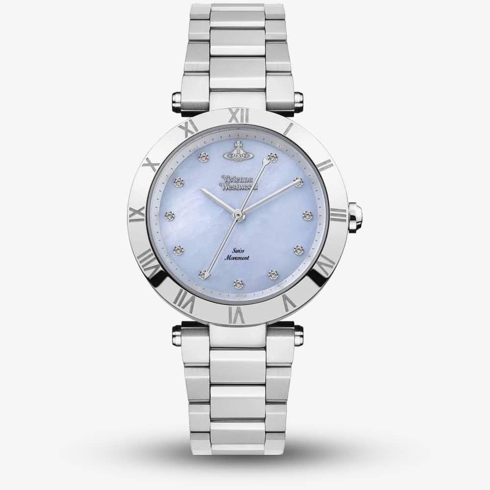 Inspired by 17th century design and architecture this stunning timepiece takes specific influence from the Montagu House. Merging punk, history and architecture this beautiful watch features a blue mother of pearl dial adorned with diamond hour markers. The dial is also decorated with the iconic Vivienne Westwood Orb at 12 o'clock and roman numeral markings around the bezel. Finished with a Swiss Quartz movement and a stainless steel bracelet.