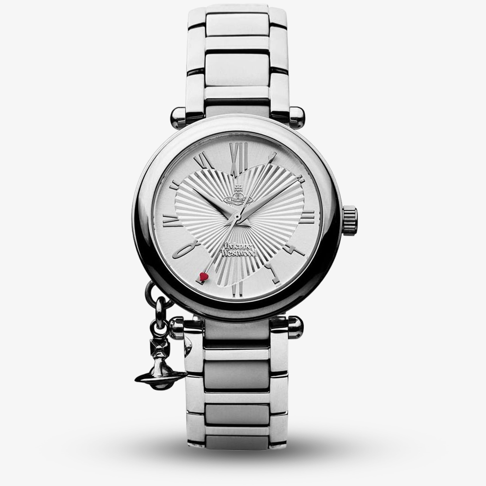 Created in stainless steel, this stunning Vivienne Westwood timepiece will add a sophisticated finish to your everyday look. The piece features a silver dial that is set with a heart shaped guilloche design. Stainless steel Roman numeral hour markers and hands are accentuated with a red heart seconds hand. The piece is finished with a free moving iconic orb charm and a stainless steel bracelet with a push deployment clasp fastening.