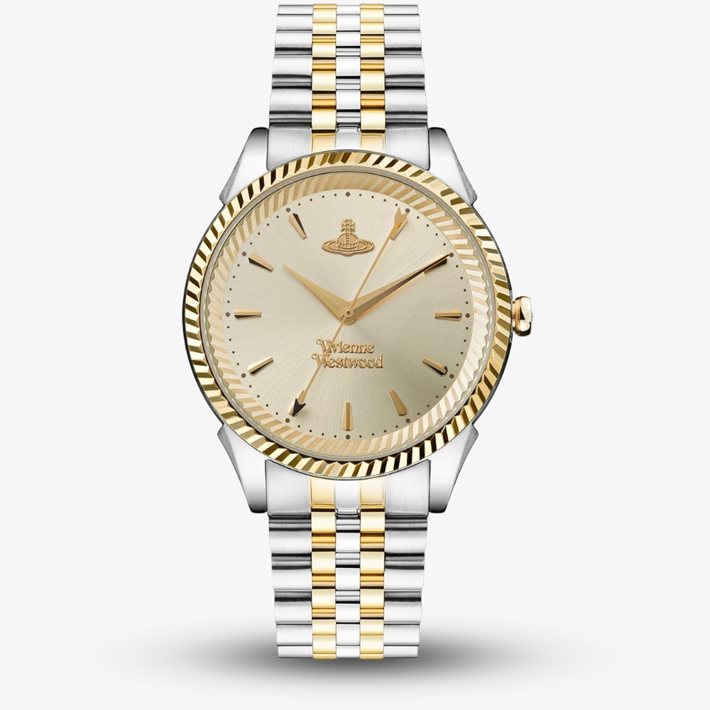 Crafted with a two-tone stainless steel bracelet and case, this watch showcases a radiant champagne dial adorned with the Vivienne Westwood Orb logo, symbolising heritage and individuality. The delicate gold and silver tones blend seamlessly, offering versatility for both day and evening wear. A polished bezel, sleek hands, and refined detailing complete its sophisticated look, making it a must-have accessory.
