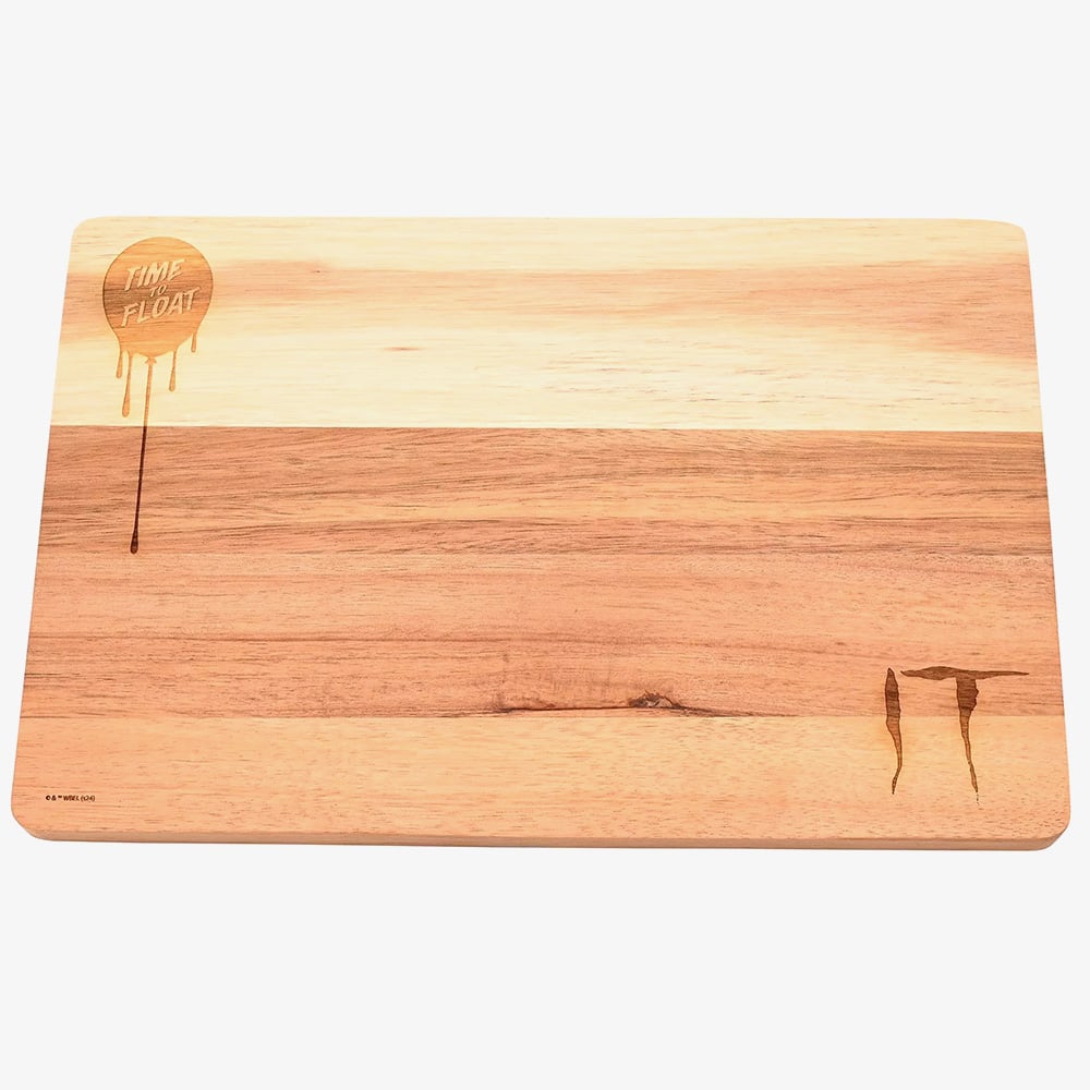 Add a chilling touch of movie nostalgia with the IT Serving Board detailed with Time to Float. Crafted from wood, this unique board is perfect for fans of IT or horror enthusiasts looking to bring a playful, spooky twist to their kitchenware. Ideal for serving snacks at movie night or as a distinctive gift for any horror movie lover.