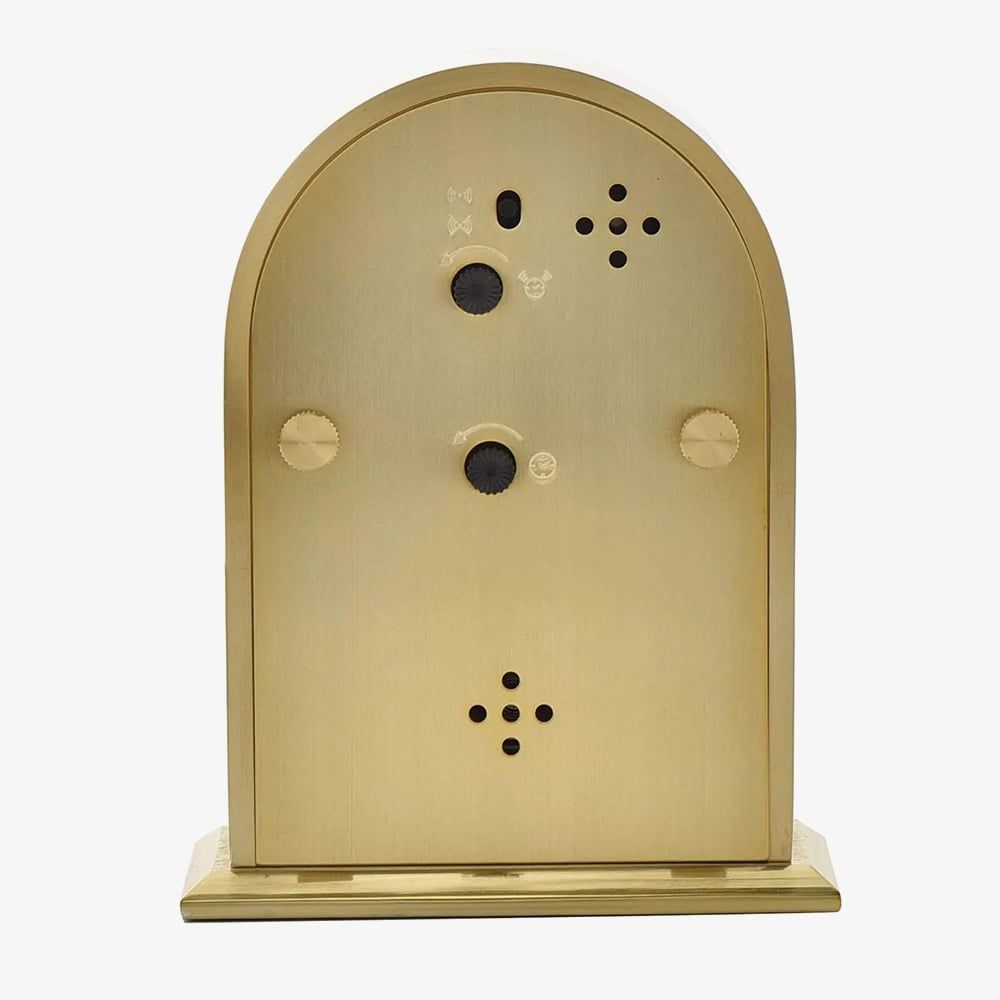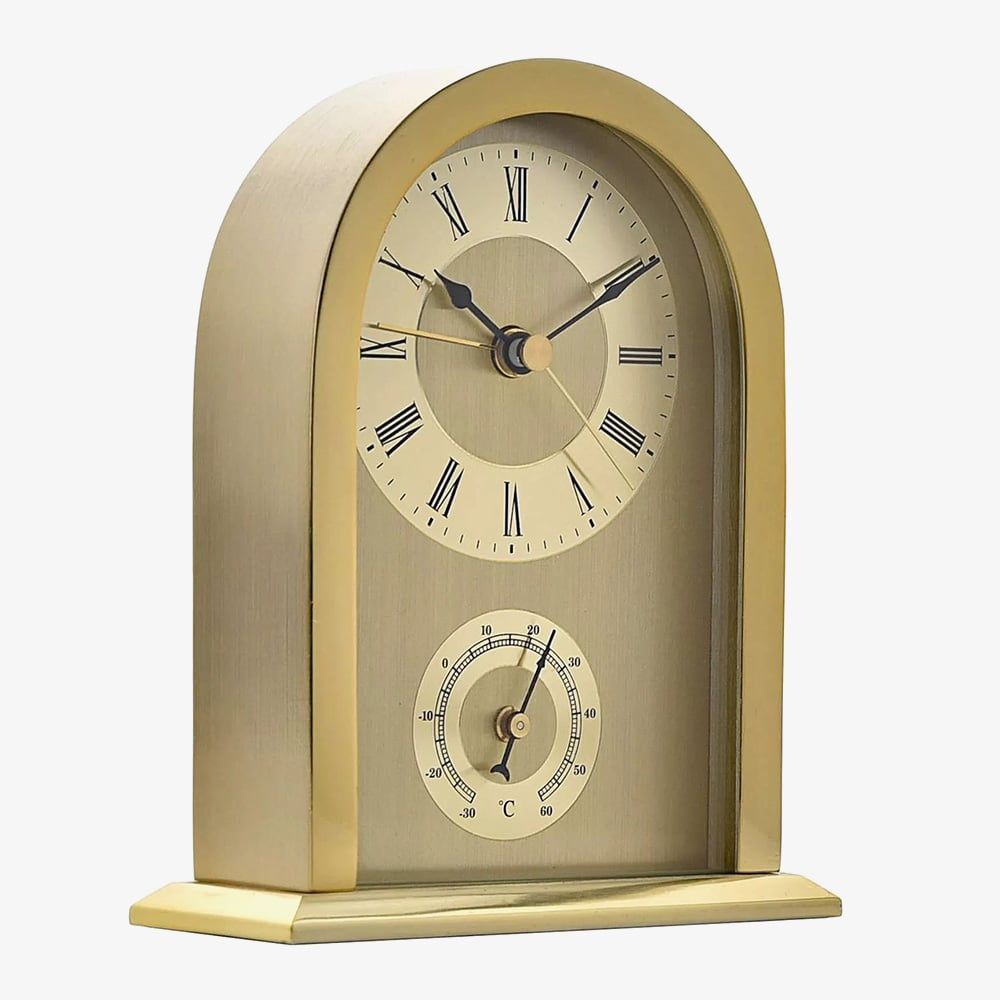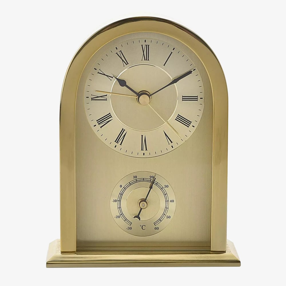 A traditional design by WM Widdop, this mantel clock is crafted from gold tone aluminium in an arched shape to suit many home decors. Powered by the Quartz movement for reliable timekeeping, this clock features Roman numerals, black spade hands and has a beep alarm function with an on/off switch. Complete with a small thermometer gauge for extra functionality. Battery operated, not included.