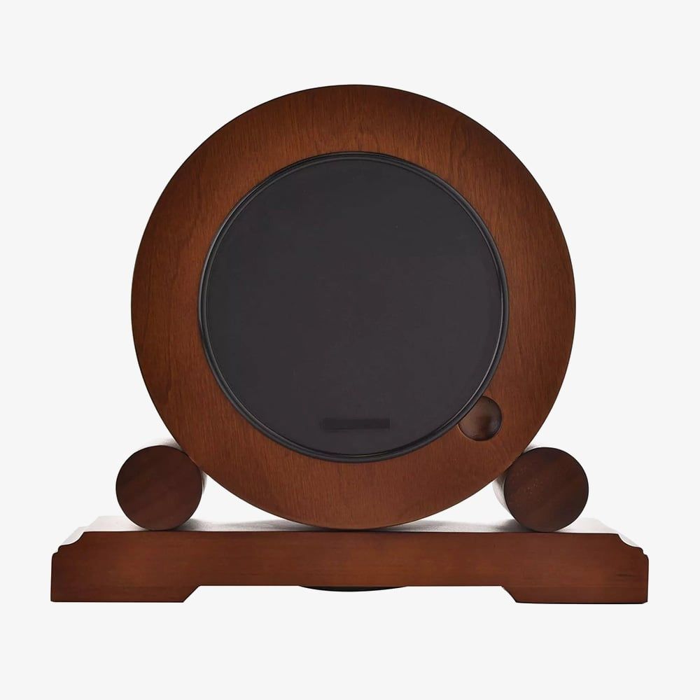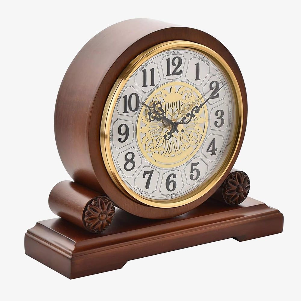 A classically styled mantel clock by WM Widdop, carved from wood with a walnut finish into a barrel shape. The intricately detailed white dial has clear Arabic hour numbers, black serpentine hands and a gold tone motif that complements the surrounding bezel. The ornate design of this clock is perfectly complemented by the Westminster chime melody. Battery operated, not included.