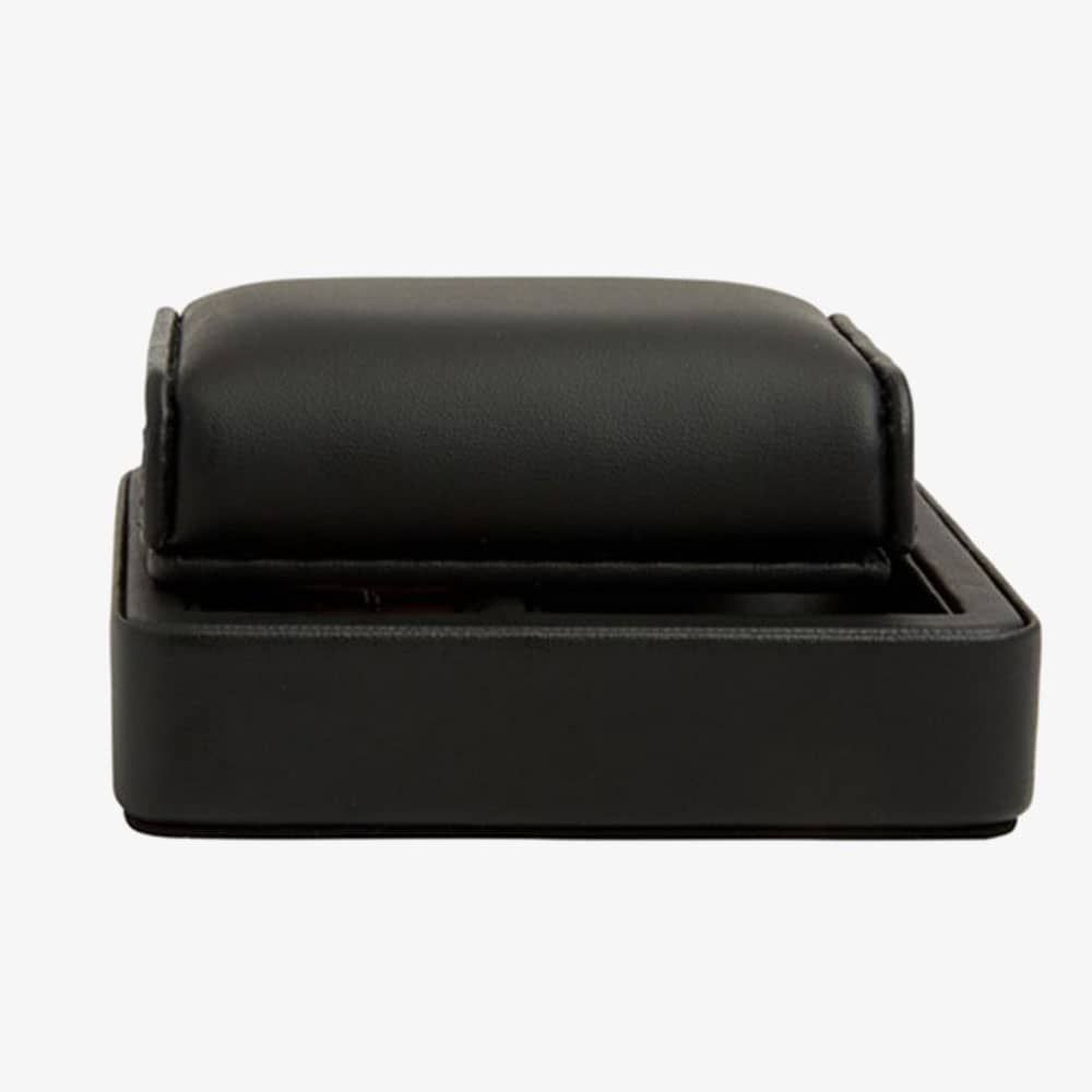 Proudly display your watches wherever you are, ensuring they remain safe, scratch-free, and easily accessible every day. With our patented folding mechanism and travel pouch, this piece is both functional and compact – perfect for the traveller’s next adventure. An essential for any collector who loves to travel in style, the expertly crafted Axis black and copper single travel watch stand is crafted in vegan leather and features a cufflink and coin storage tray in the base. Its cushioned top cushion supports and cradles your timepieces, offering a modern yet practical solution for both displaying and safeguarding your collection.