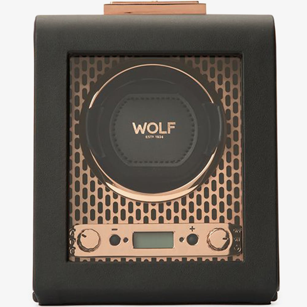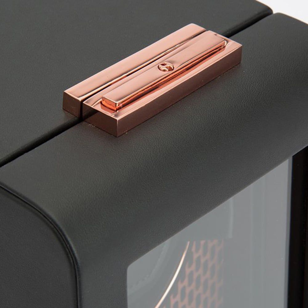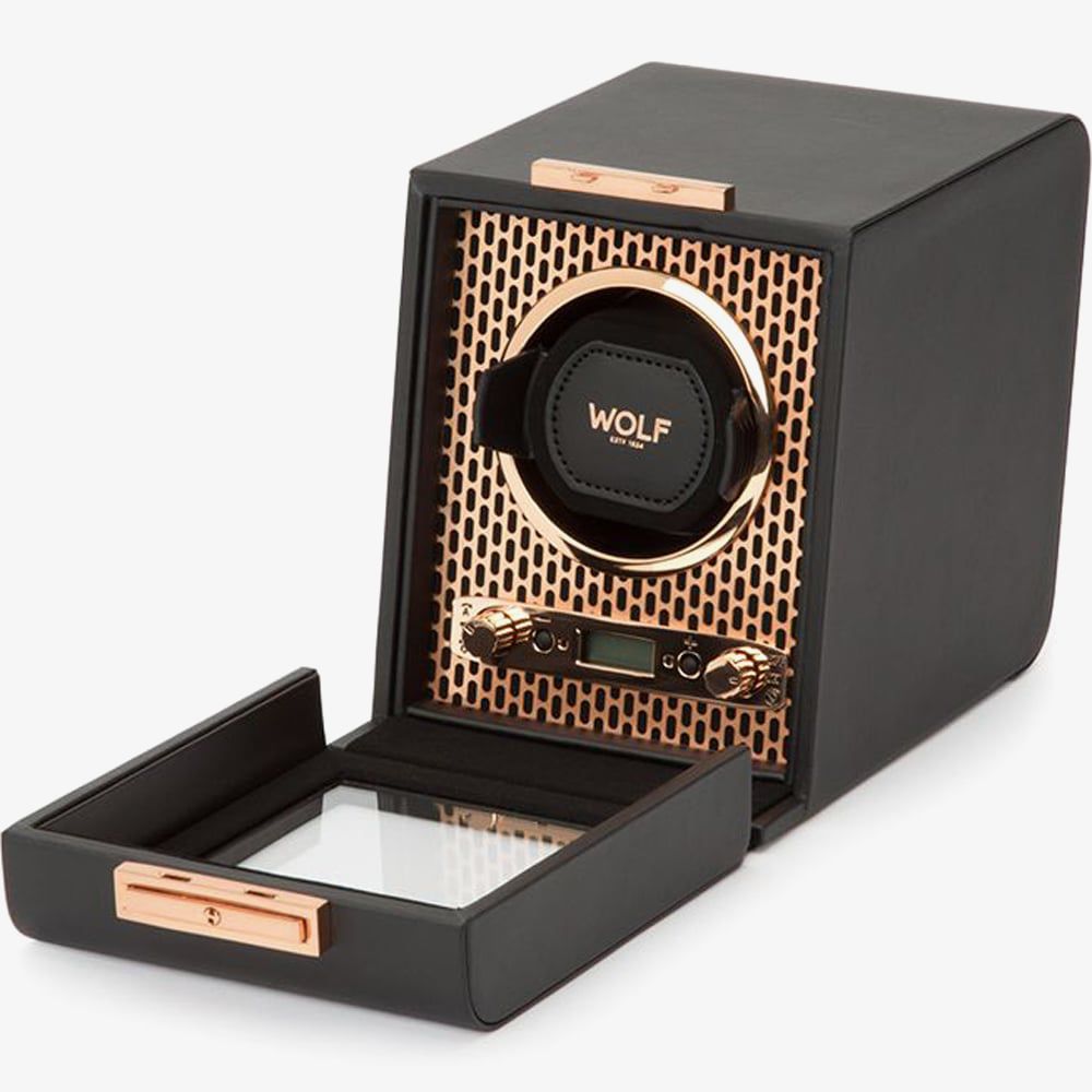 WOLF bring us the Black & Copper Tone Axis Single Winder. Featuring a black vegan leather box measuring 14 cm L x 20.8 cm W x 17.4 cm H, with a locking glass cover, an LCD display and a single winding module. WOLF watch winders count the precise number of rotations compared with other watch winders that estimate the number of rotations. The unit can be powered by AC power or D-Cell/ Lithium batteries and has a power reserve setting to accommodate watches with a power reserve, allowing power reserve watches to release stored energy before the winding program begins. This watch winder also features a lock-in cuff for a secure fit.