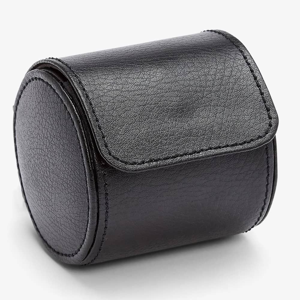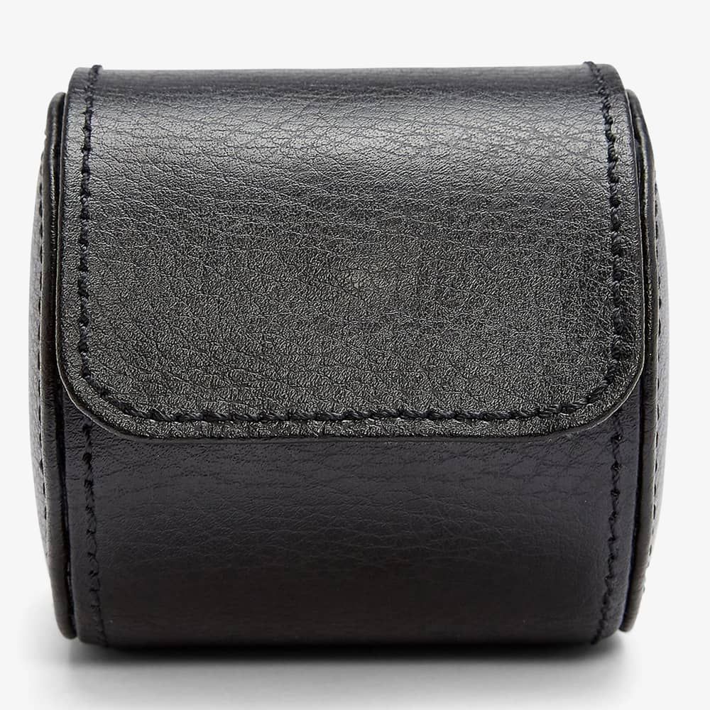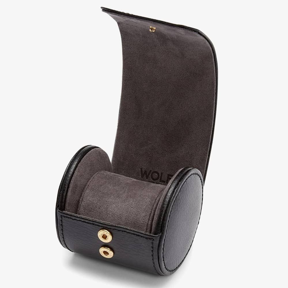 Wolf Blake Single Watch Roll 529080. This simple watch roll is crafted from classic black soft leather, with ultra-suede lining for extra protection. There are two chrome snap buttons to fasten securely. A perfect travel accessory to store your favourite watch, on the move. Dimension: 7.3cm L x 8.26cm W x 8.26cm H.