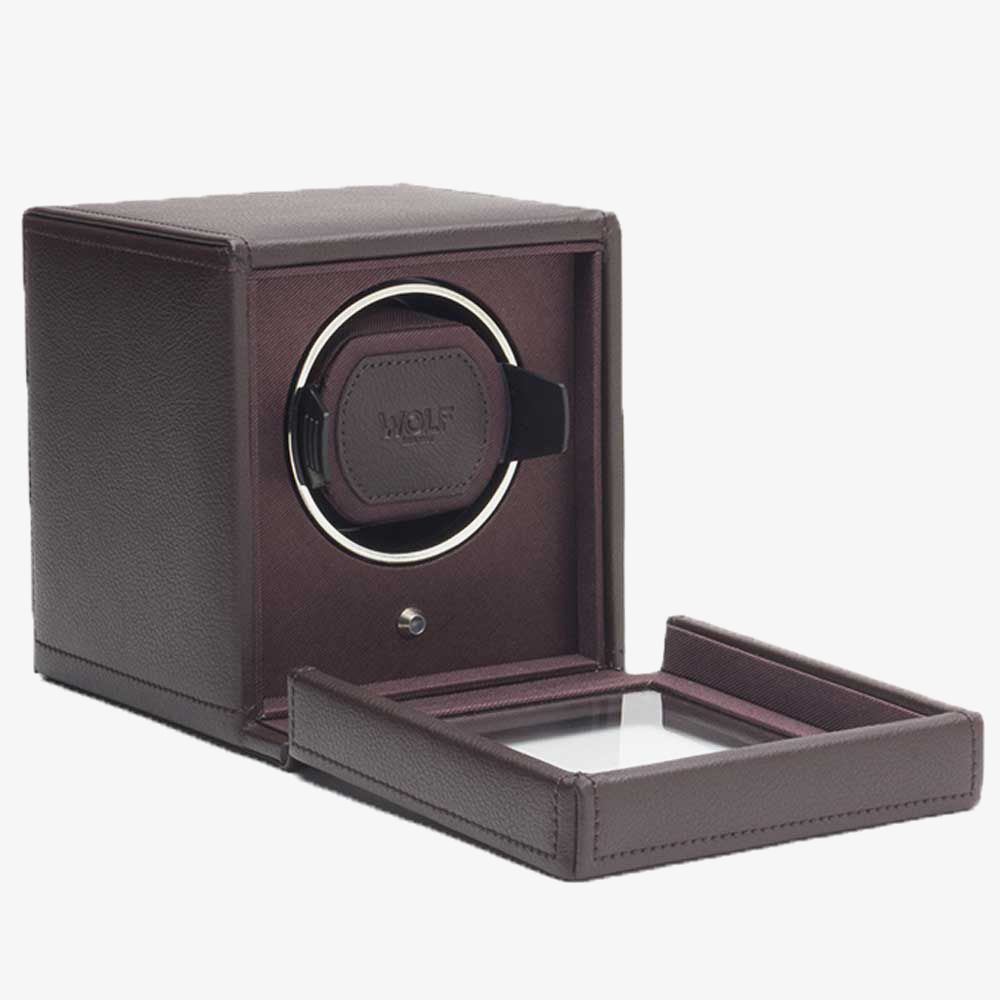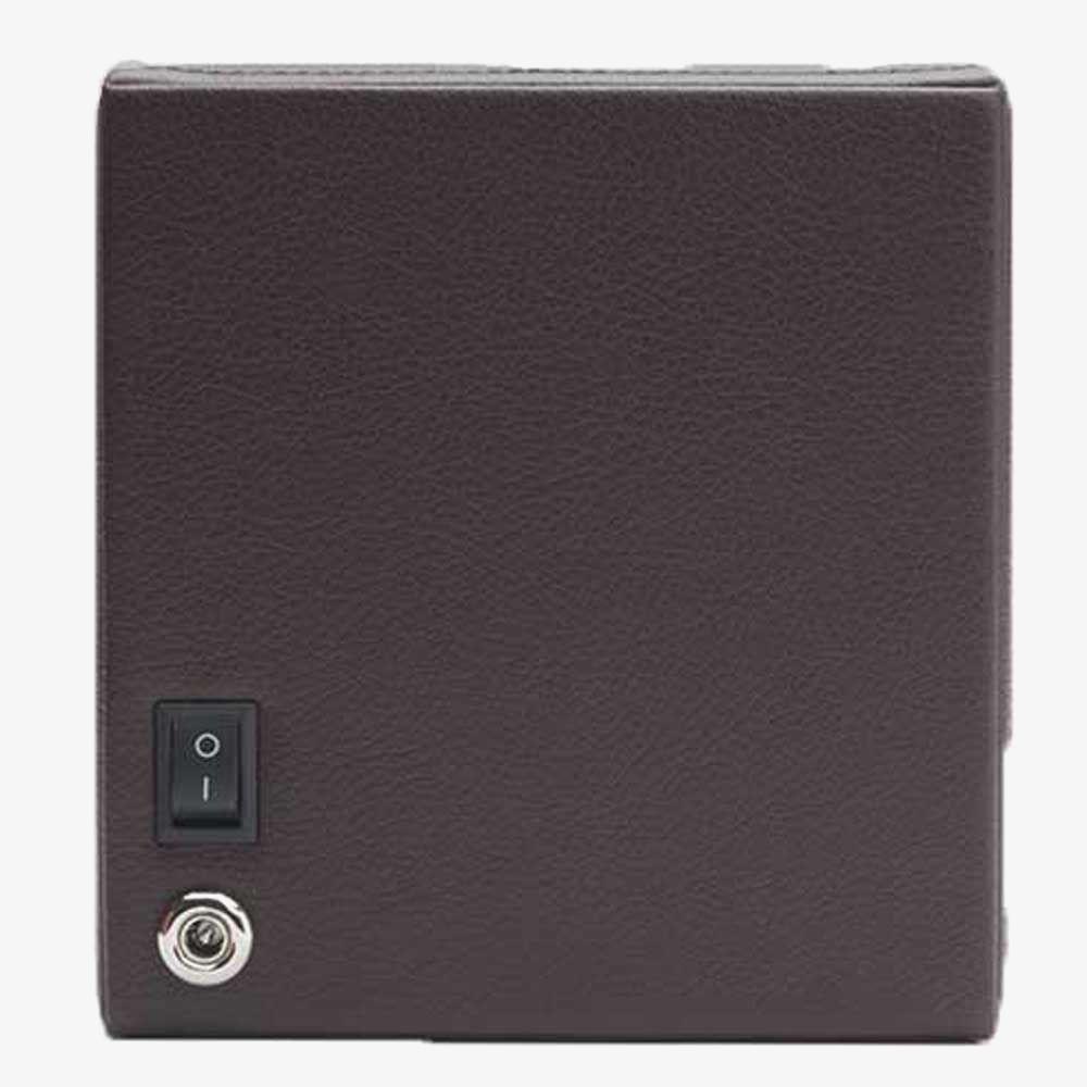 Introducing the Wolf watch winder, an impressive piece of engineering to power your automatic watches. The luxurious minimalist design features brown saffiano leather, chrome finished hardware and a glass cover. Winds using a patented rotation program with 900 bi-directional turns per day. The single winding module fits watches up to 52mm case size.