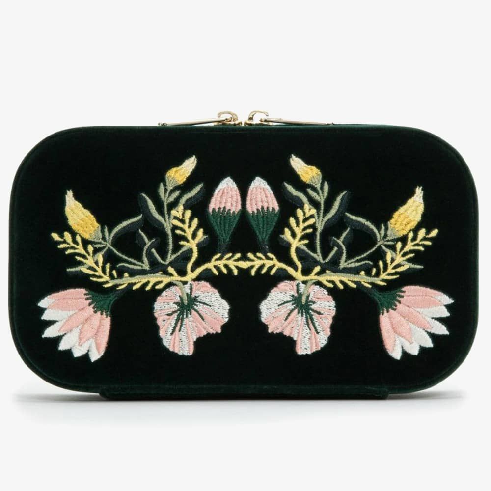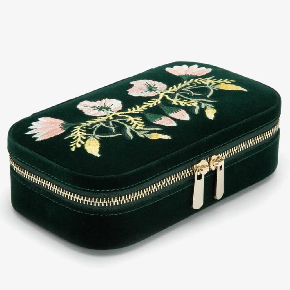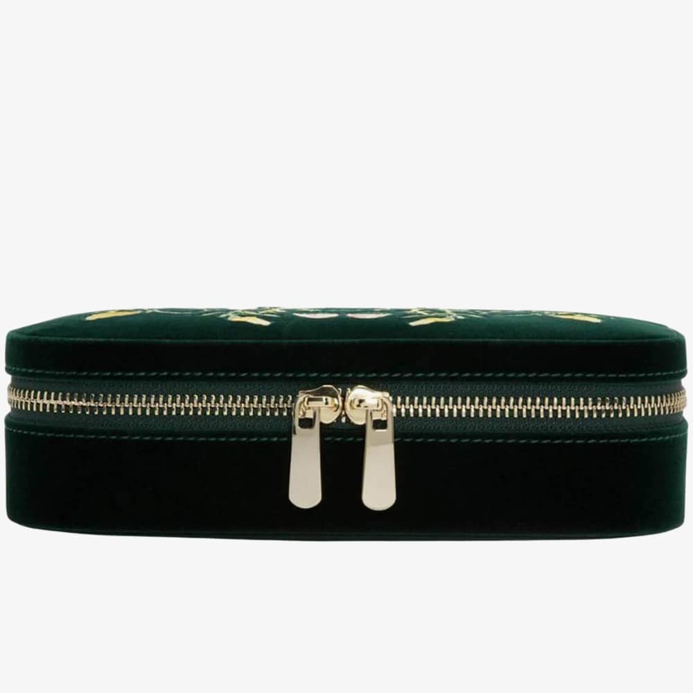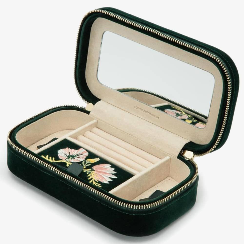 Wolf Zoe Forest Green Travel Zip Jewellery Case 393312. This elegant forest green floral embroidery jewellery case, is crafted from velvet and LusterLoc lining. LusterLoc fabric lining absorbs hostile gases known to cause tarnishing, which may help to prevent tarnishing for up to 35 years. This case can be fastened with a double gold-plated zip lock. Inside there are, 3 ring rolls, medium compartment with cover, an embroidered floral mirror, and 2 small compartments. A perfect accessory to store jewellery on the move. Dimensions: 20.5cm L X 11.5cm W x 5.5cm H.