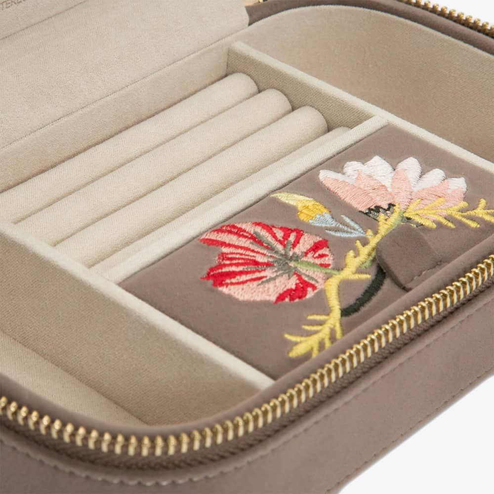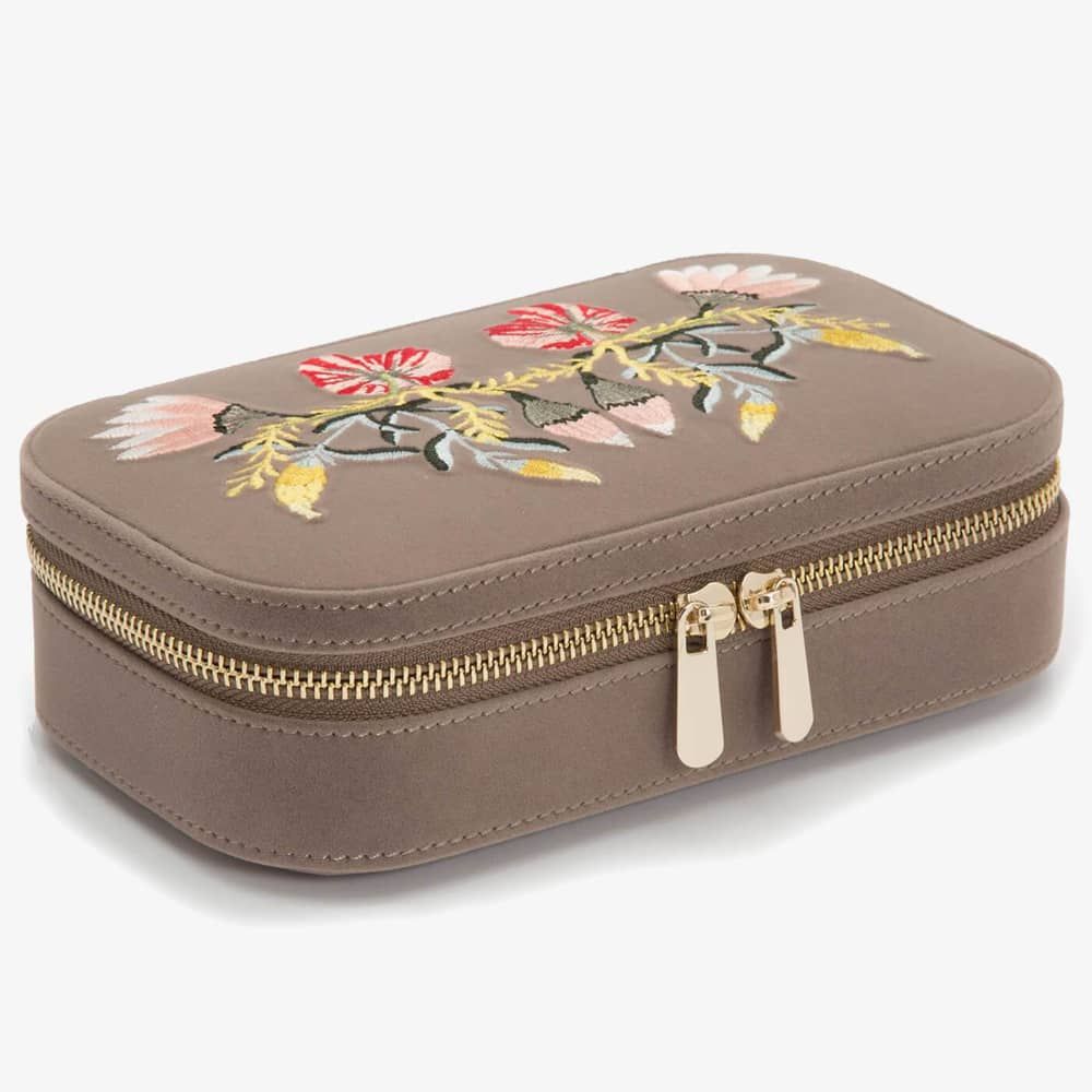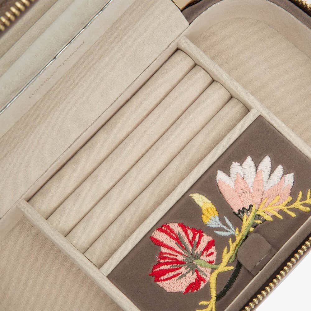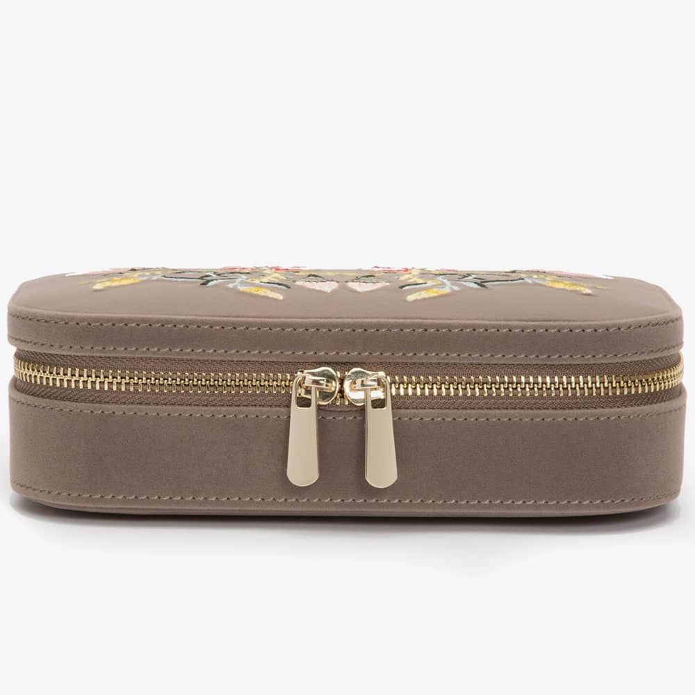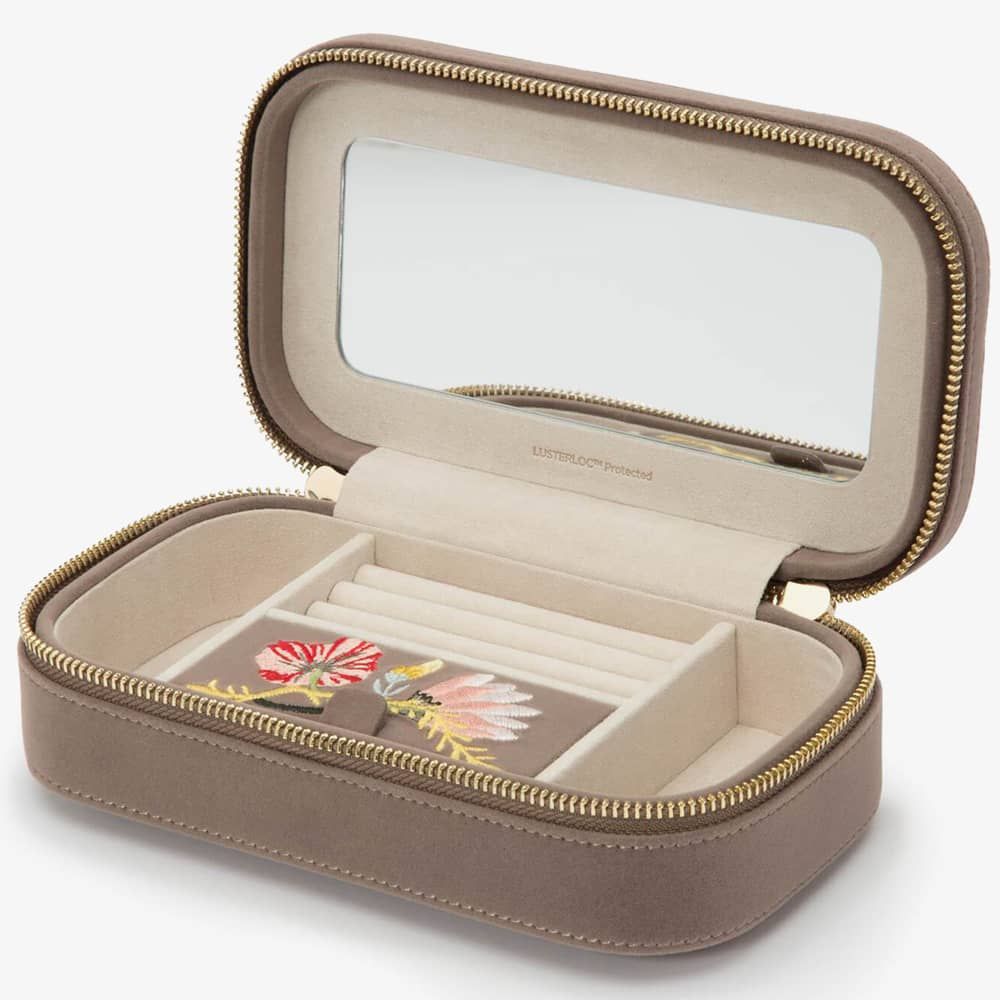 Wolf Zoe Mink Travel Zip Jewellery Case 393313. This elegant mink floral embroidery jewellery case, is crafted from velvet and LusterLoc lining. LusterLoc fabric lining absorbs hostile gases known to cause tarnishing, which may help to prevent tarnishing for up to 35 years. This case can be fastened with a double gold-plated zip lock. Inside there are, 3 ring rolls, medium compartment with cover, an embroidered floral mirror, and 2 small compartments. A perfect accessory to store jewellery on the move. Dimensions: 20.5cm L X 11.5cm W x 5.5cm H.