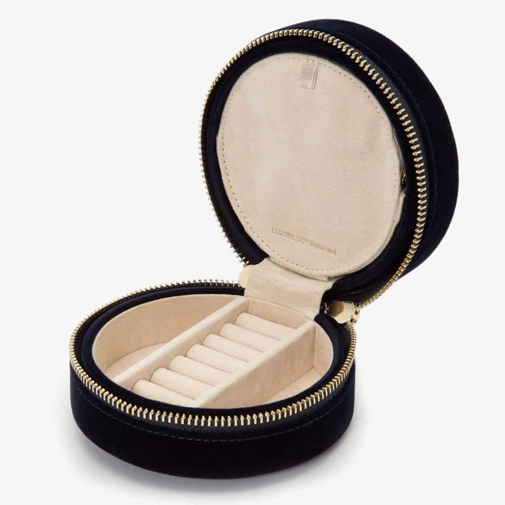 The Zoe Travel Round adds a touch of romance to your travel accessories with its elegant floral embroidery and jewel-tone indigo velvet. This exquisite piece features a luxurious velvet exterior, LusterLoc™ interior, a zip pouch, and a mirror, blending style with functionality.