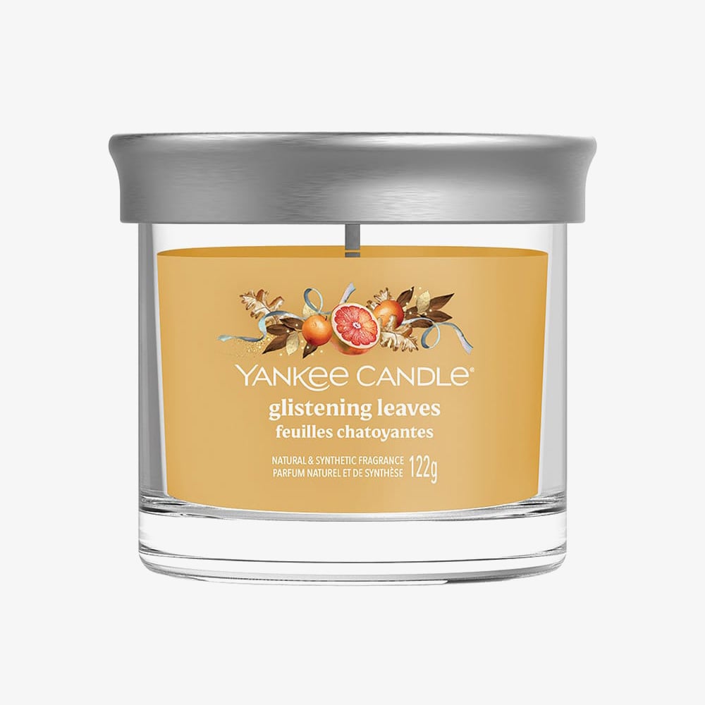 The Yankee Candle Glistening Leaves Small Tumbler Candle comes in a sleek glass jar with a brushed tin lid that doubles as a coaster. Made with a premium soy wax blend and a single wick, it fills your space with a fruity and floral autumnal scent of amber, vanilla and grapefruit. Perfect for gifting or trying a new fragrance.